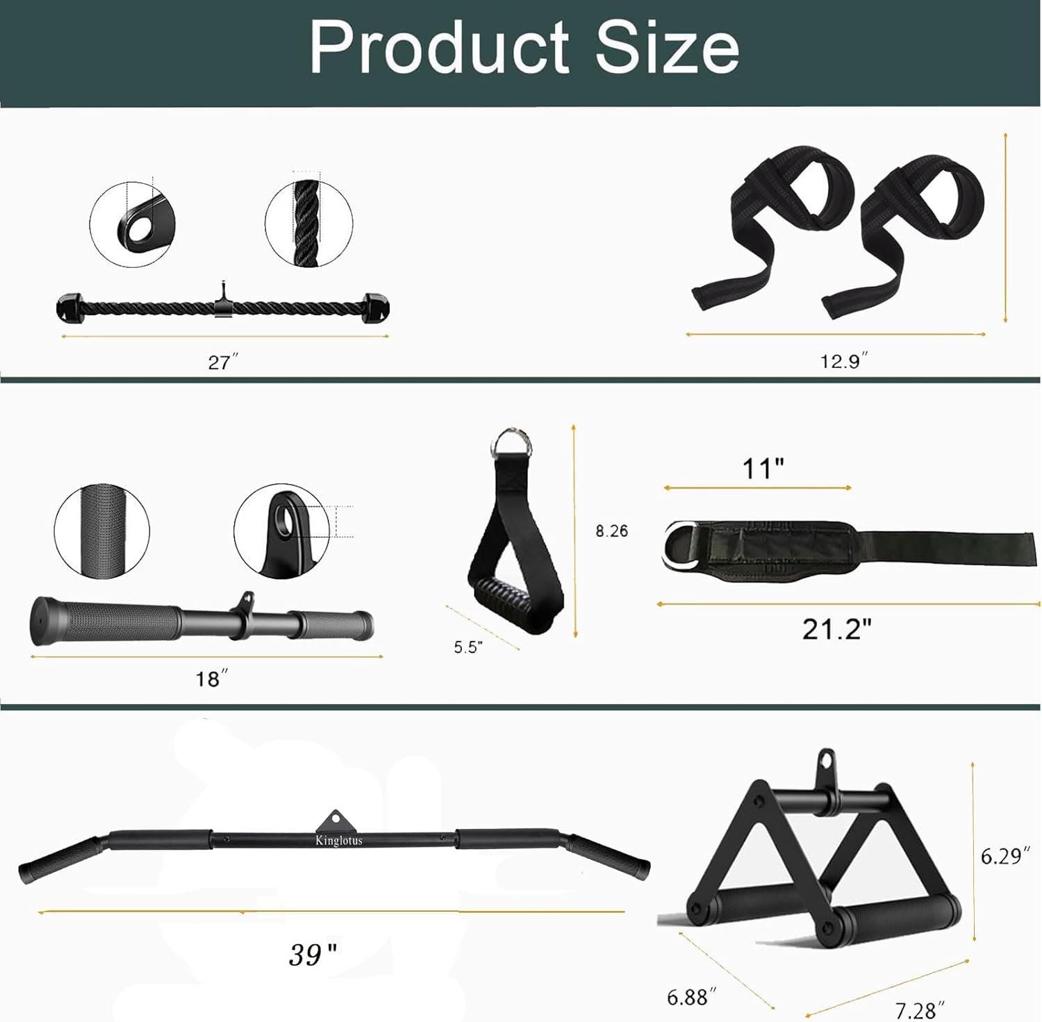 gym attachments for cable machine:1*39.37 inch crimp pull down bar+1* double D handle+1 *straight swivel bar+1 *nylon braided triceps rope+2 *ankle straps+2 *cable machine handle+4 *snap hooks+2 *lifting wrist straps,These cable accessories are compatible with most cable systems and machines