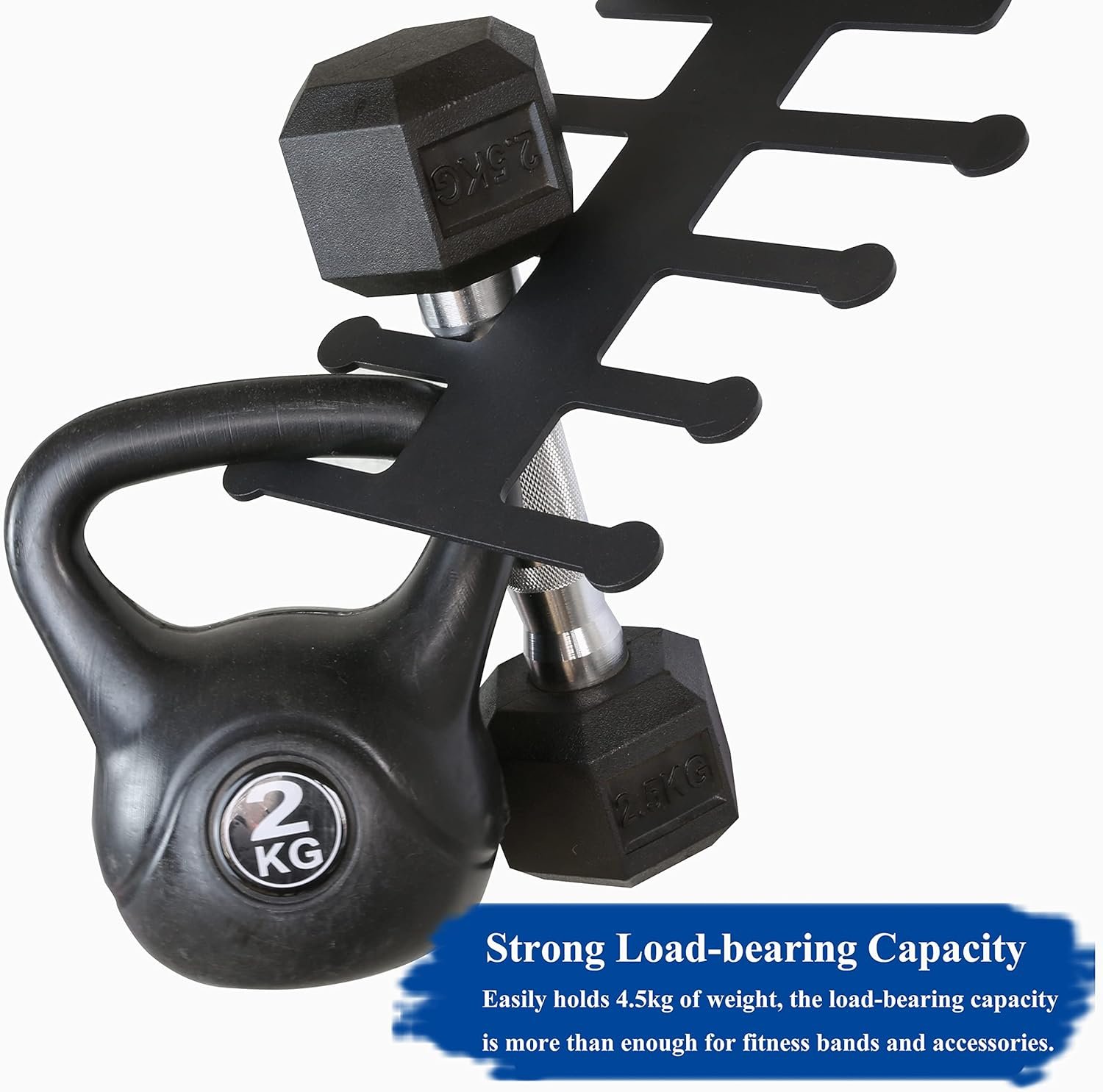 Size-24cm(L) *20.5cm(W) *4cm(H).The fitness bands rack is made of 2.5mm thick plate, which can easily bear 8kg, can be used to hang fitness bands and fitness accessories with drawstrings