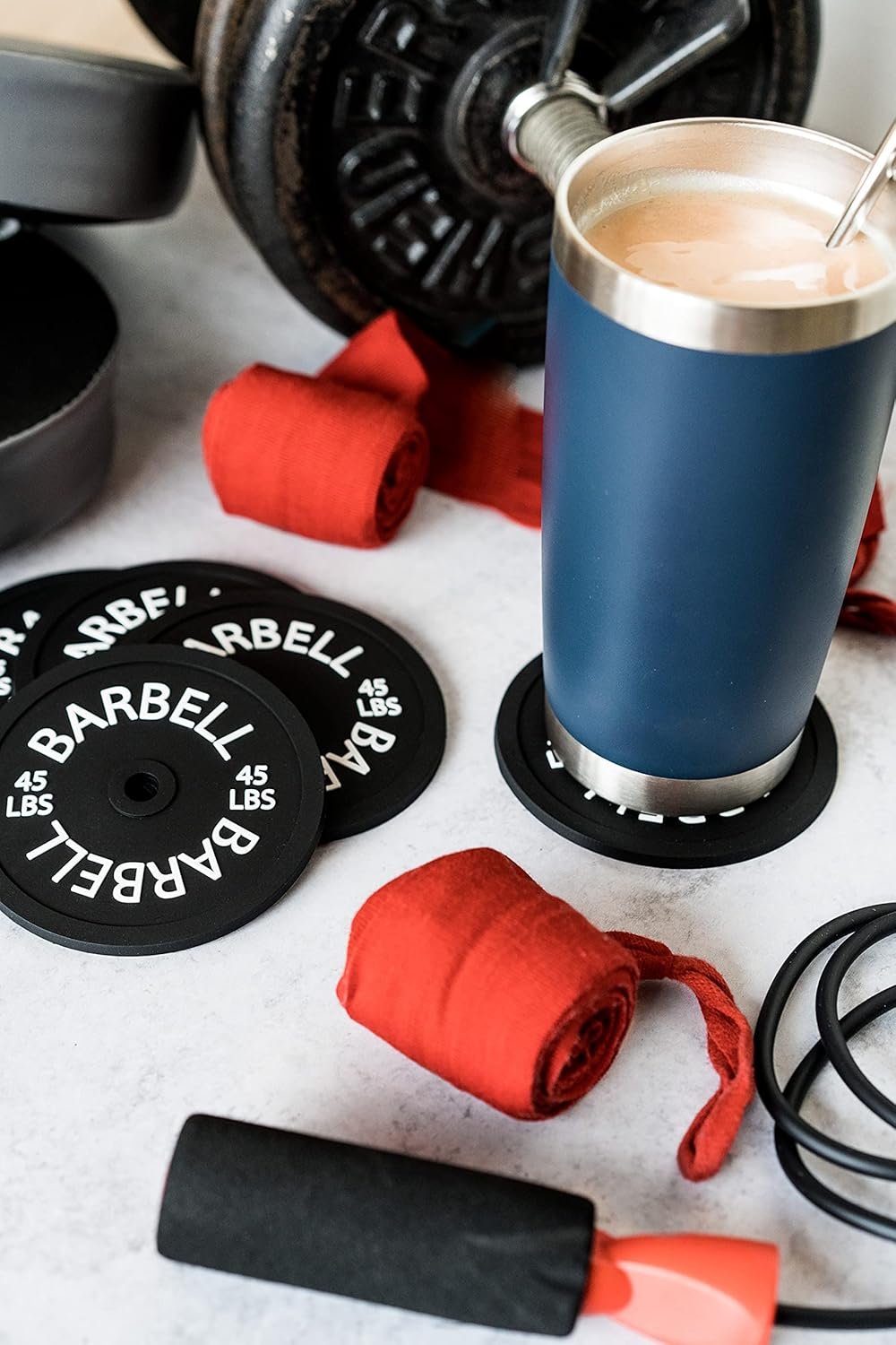 Durable Coasters Set of 6 – The perfect drink coasters for gym & fitness advocates do exist. This set of 6 absorbent coasters for drinks provides stain and heat resistant protection. The silicone coasters base provides a nonslip grip to your table’s surface. Each barbell coaster has a 3.8 inch diameter.