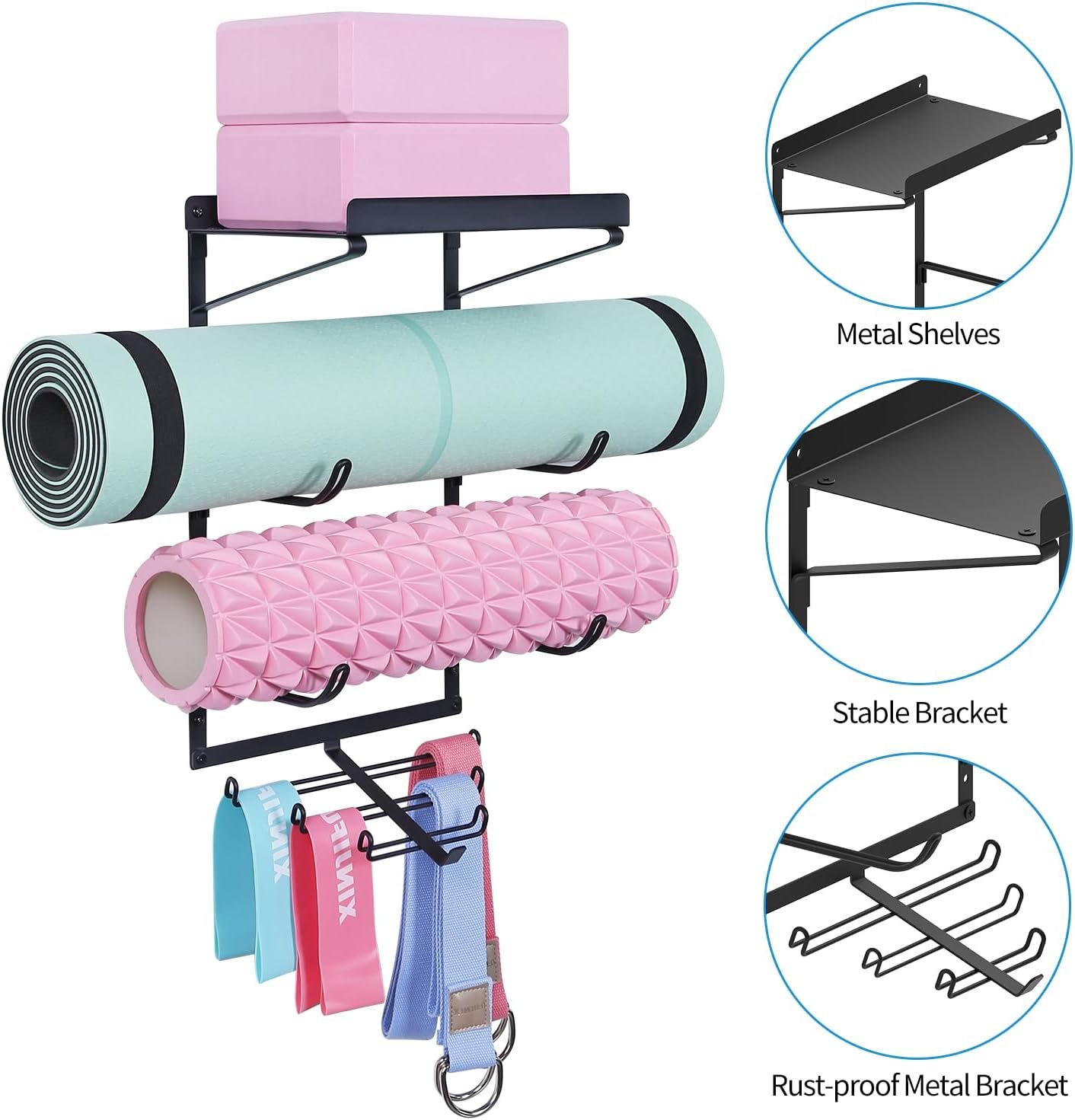 HOME GYM ACCESSORIES: This yoga mat holder can store your yoga mats, foam rollers, exercise bands very well and more at your fingertips. It is a nifty display rack, not only display your gym equipment, but also display your bathrobes and blankets. The shelves can also display small objects such as yoga block, picture frames, water cups, etc., to add color to your room.