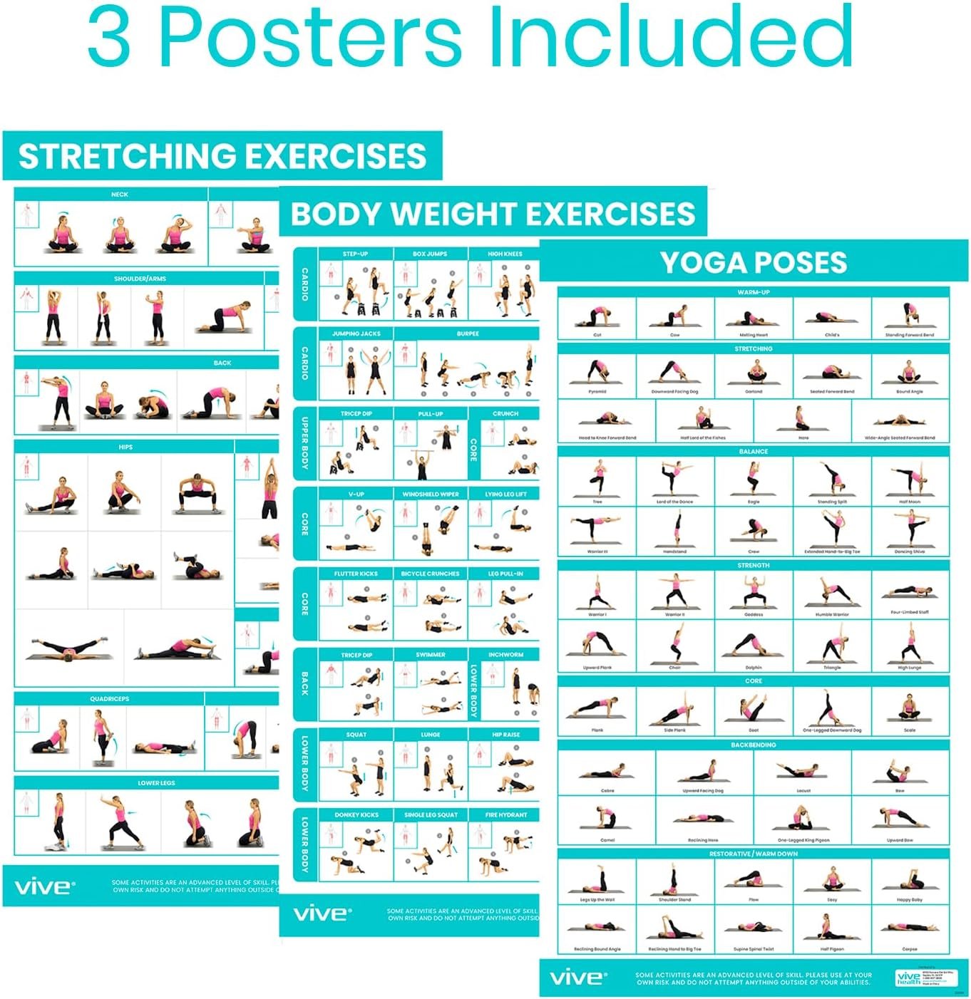 NO SPECIAL EQUIPMENT REQUIRED WITH THESE 3 POSTERS: Dive into the Vive fitness set with 146 total exercises. Poster 1 focuses on bodyweight & HIIT routines. Poster 2 showcases full-body stretches. Poster 3 guides you through yoga poses for all levels. No special equipment needed – transform any space into your personal gym.