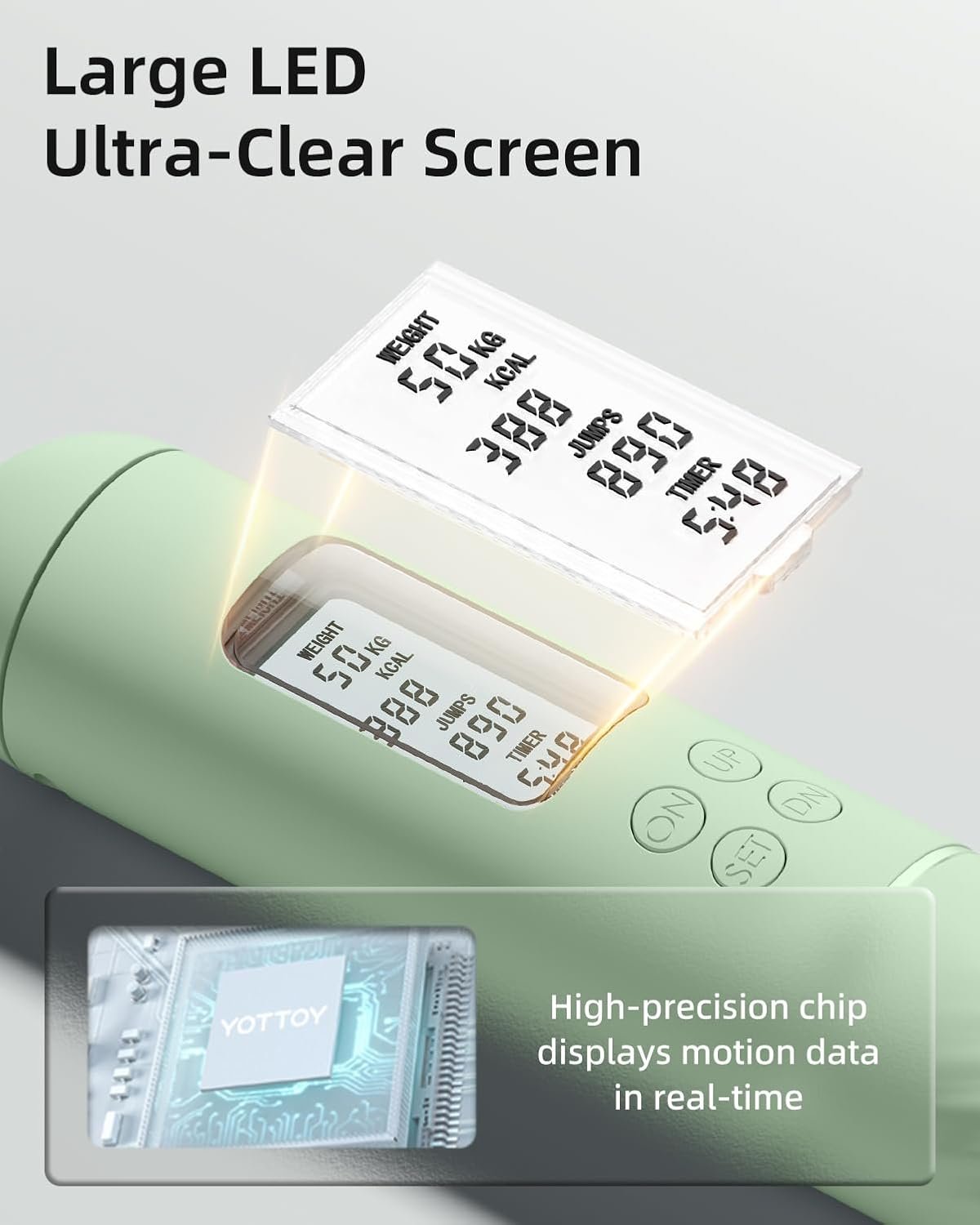 1.YOTTOY Jump Rope: We are dedicated to developing high-quality lightweight sports products. Our Electric Jump Rope features an HD LED display that shows the Timer, Weight, Calorie, and Circles. Set your weight and track time, number of jumps, and calories burned to achieve your fitness goals more effectively.