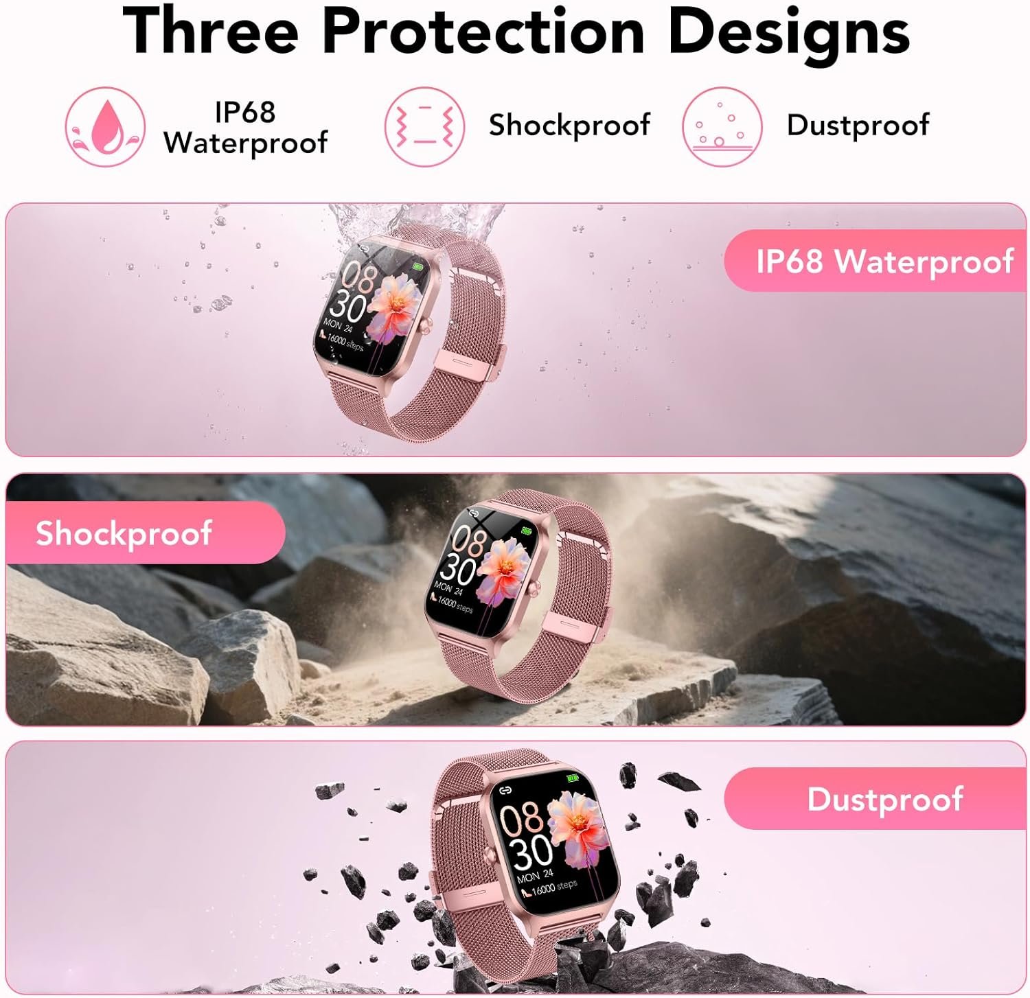 【Bluetooth 5.4 Calling and Message Notifications】The women’s watches adopt a Bluetooth 5.4 chip, ensuring a stable connection. It allows you to make or receive calls directly through the rose gold watch for women without a SIM card, making it ideal for use during workouts, driving, or busy moments. The fitness tracker keeps you connected at all times, instantly pushing notifications for incoming calls, text messages, and social media apps such as Facebook, WhatsApp, and Instagram.
