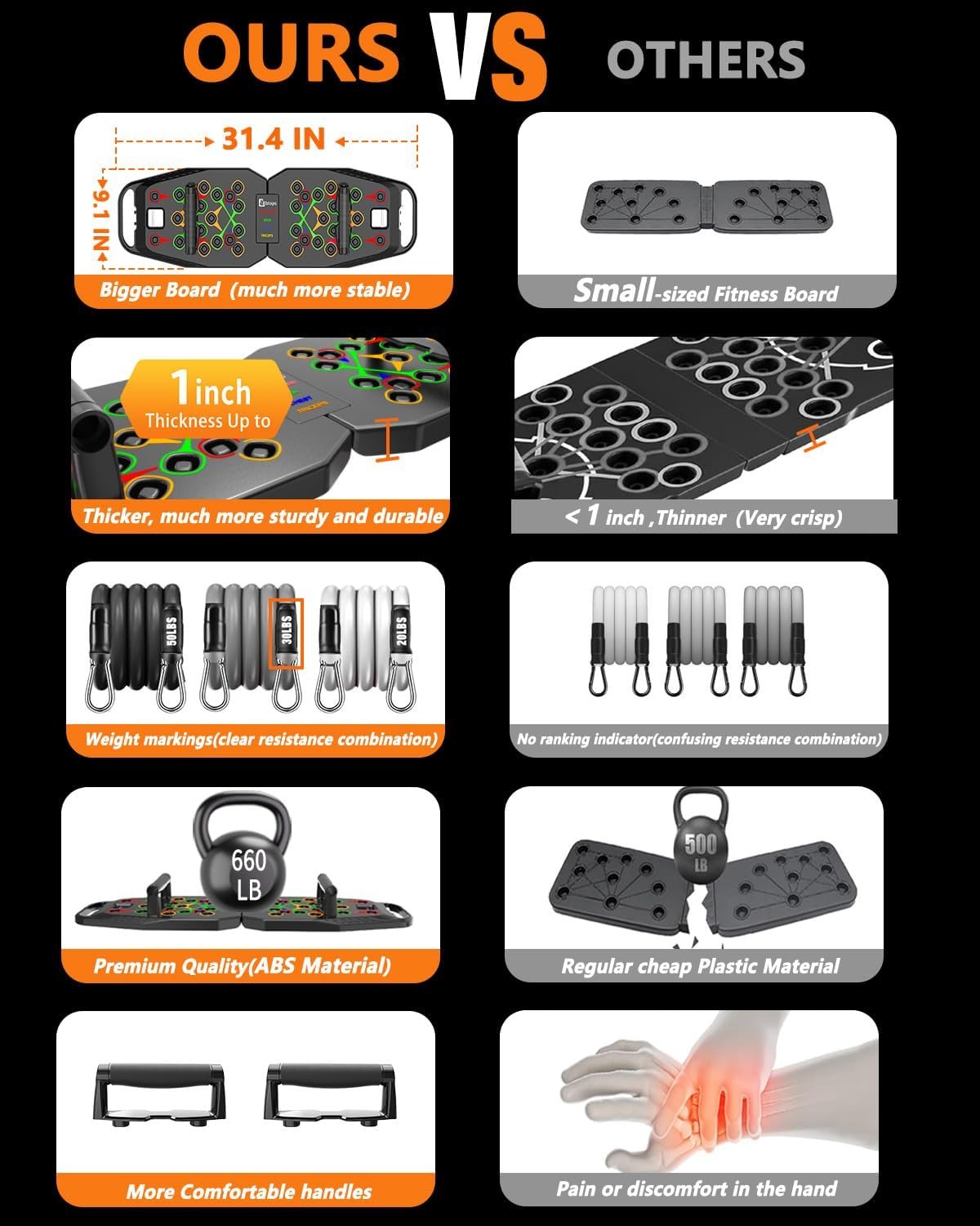 【Complete Home Gym System】Transform your home into a professional gym with the BBTOPS 25-in-1 Push Up Board System. This color-coded training board targets 6 major muscle groups (chest, shoulders, back, arms, abs, core) with precision-engineered grip positions. Built with premium ABS plastic and tested to support 660 pounds, it’s the most durable push-up board in its category.