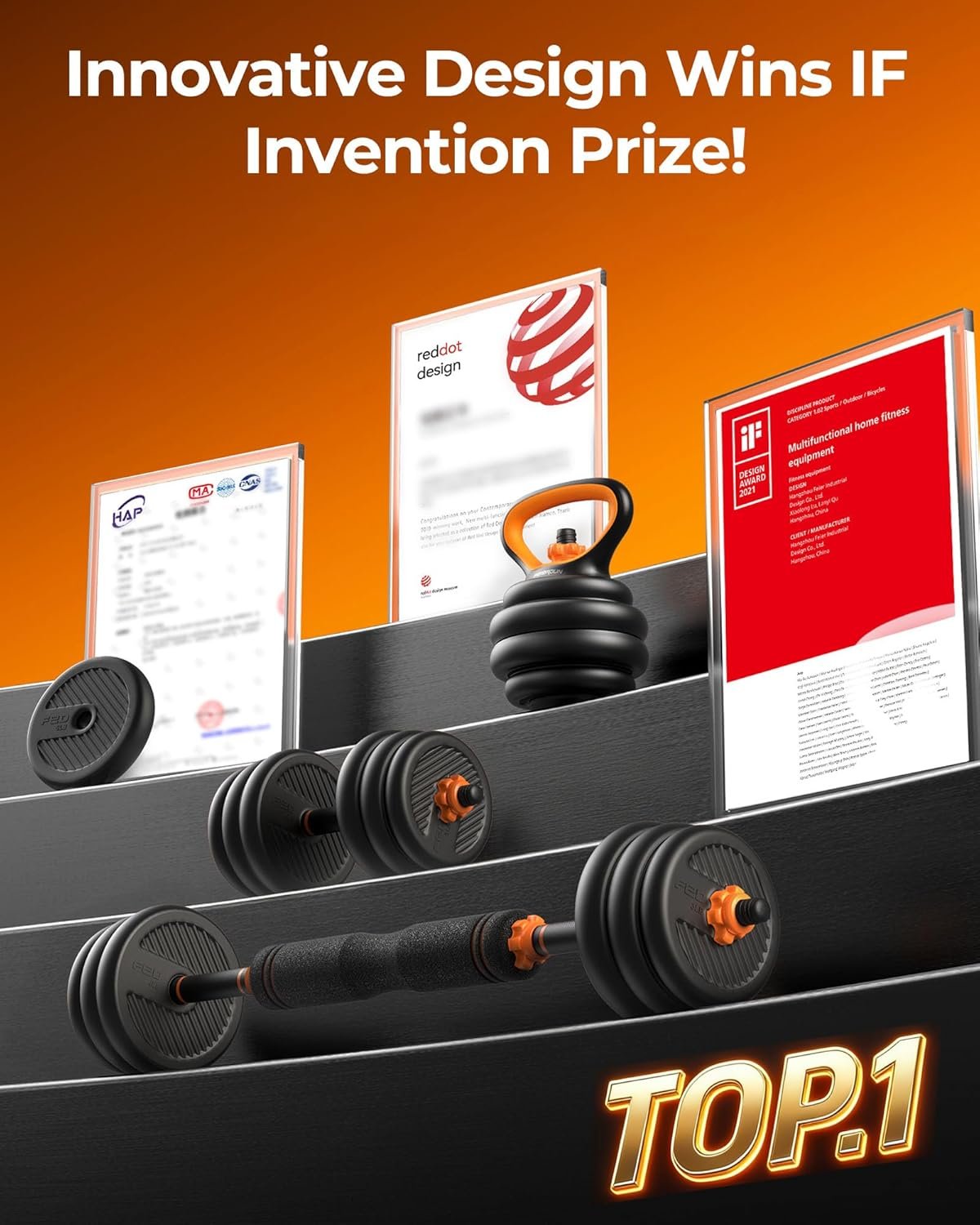 【4 in 1 Multifunctional Dumbbell Set】With it, you can get a pair of dumbbells also barbells, kettlebells, and push-up stands, which help you do many exercises including bench presses, squats, etc.