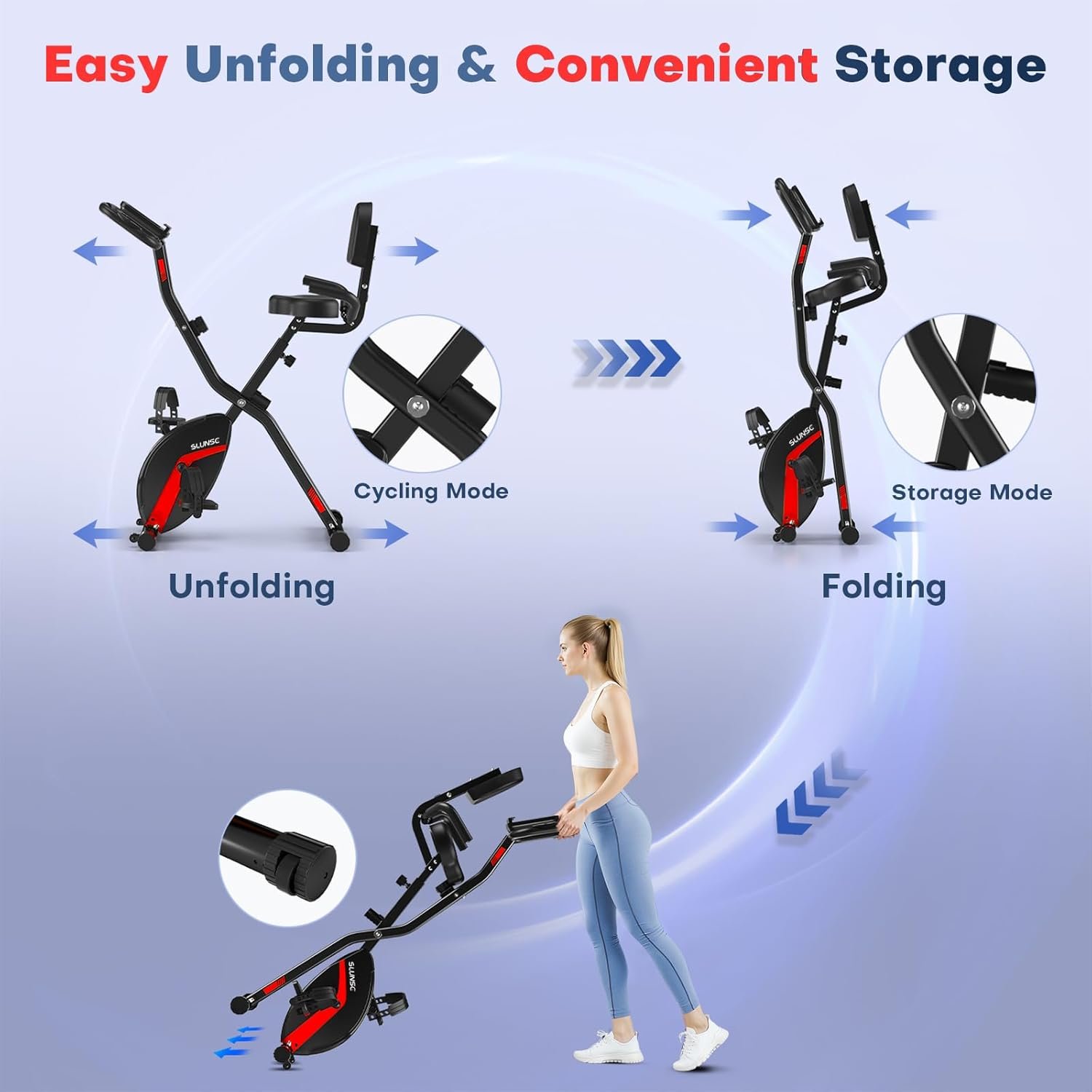 4-IN-1 Multifunction Folding Exercise Bike: SLUNSE foldable exercise bike supports you to exercise in both upright, relaxed positions, allowing you to work out your entire body and providing great convenience to help you burn calories, build strength, and improve cardiovascular health. For the price of 1 stationary bike, you can have a mini gym right at home! That’s so cool