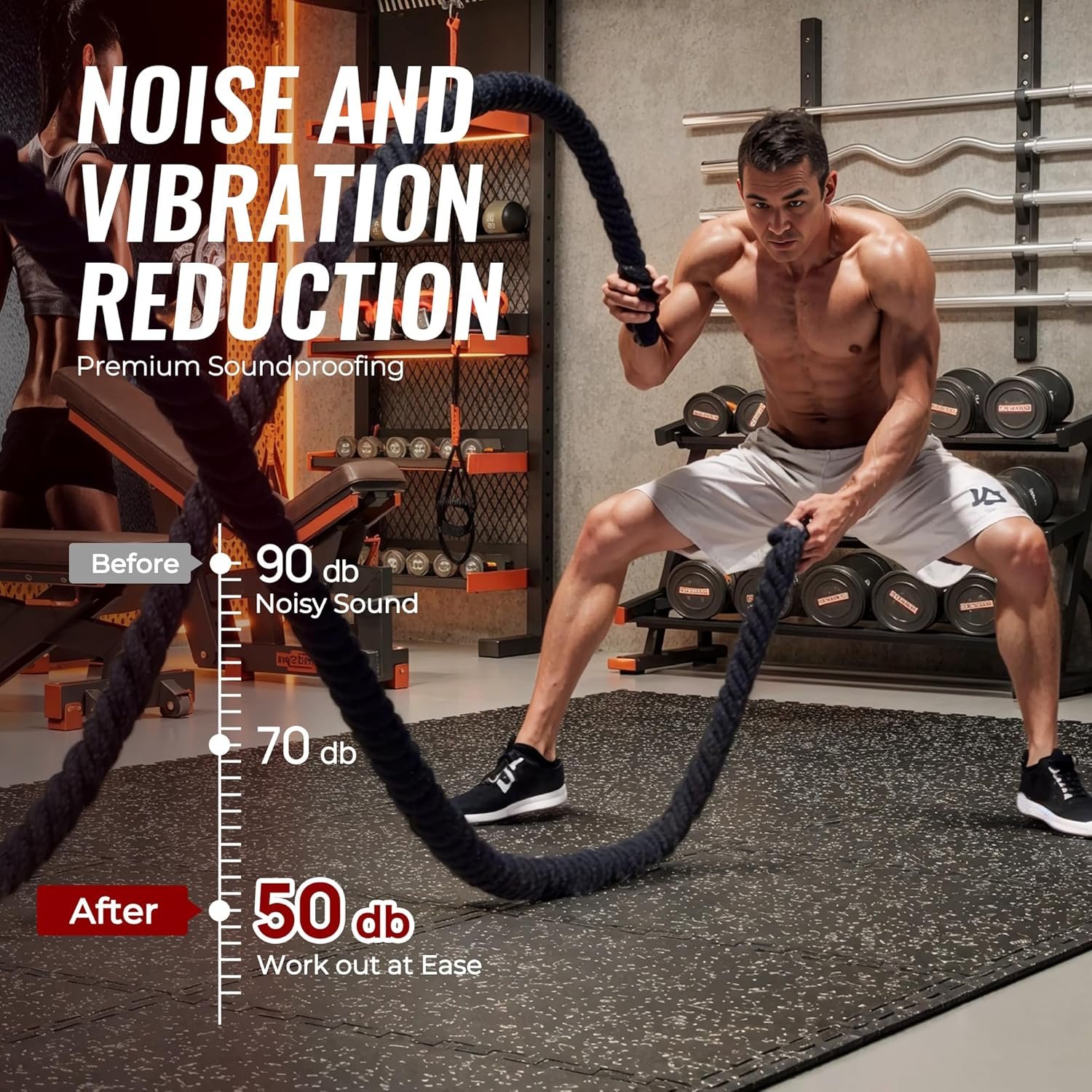 【0.79’’ Thicken Floor Mats】Upgrade to 0.79” thickness! More durable and tougher. A high-density EVA foam base combined with a sturdy EPDM rubber top. This construction can support heavy exercise equipment, ensuring it won’t tear easily due to weight or vigorous movements, guaranteeing long-lasting durability. SUPERJARE