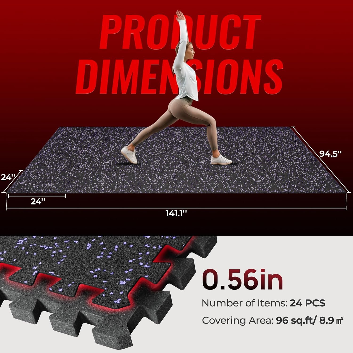 【All Places Usable】24 tiles, each with a thickness of 0.56 inch and a size of 24in x 24in, covers 96 Sq Ft. You can place this flooring mat wherever you need it! It’s suitable for a garage, gym, family fitness room or playroom.