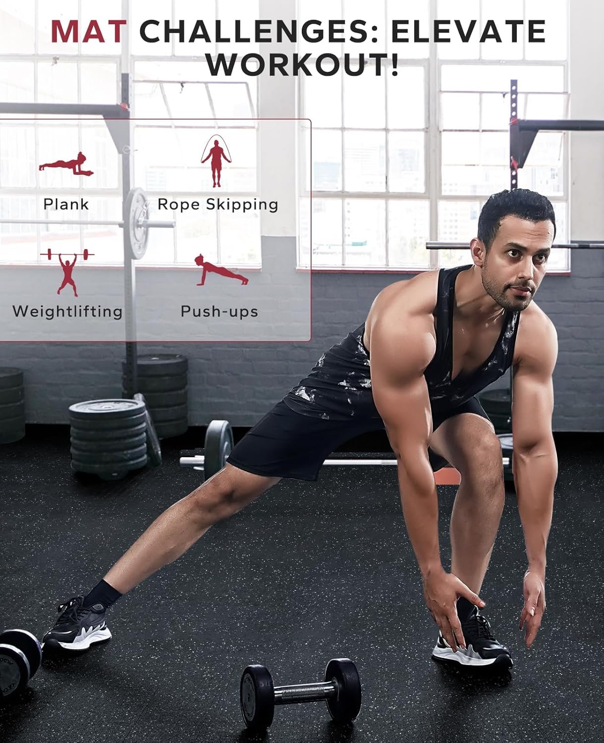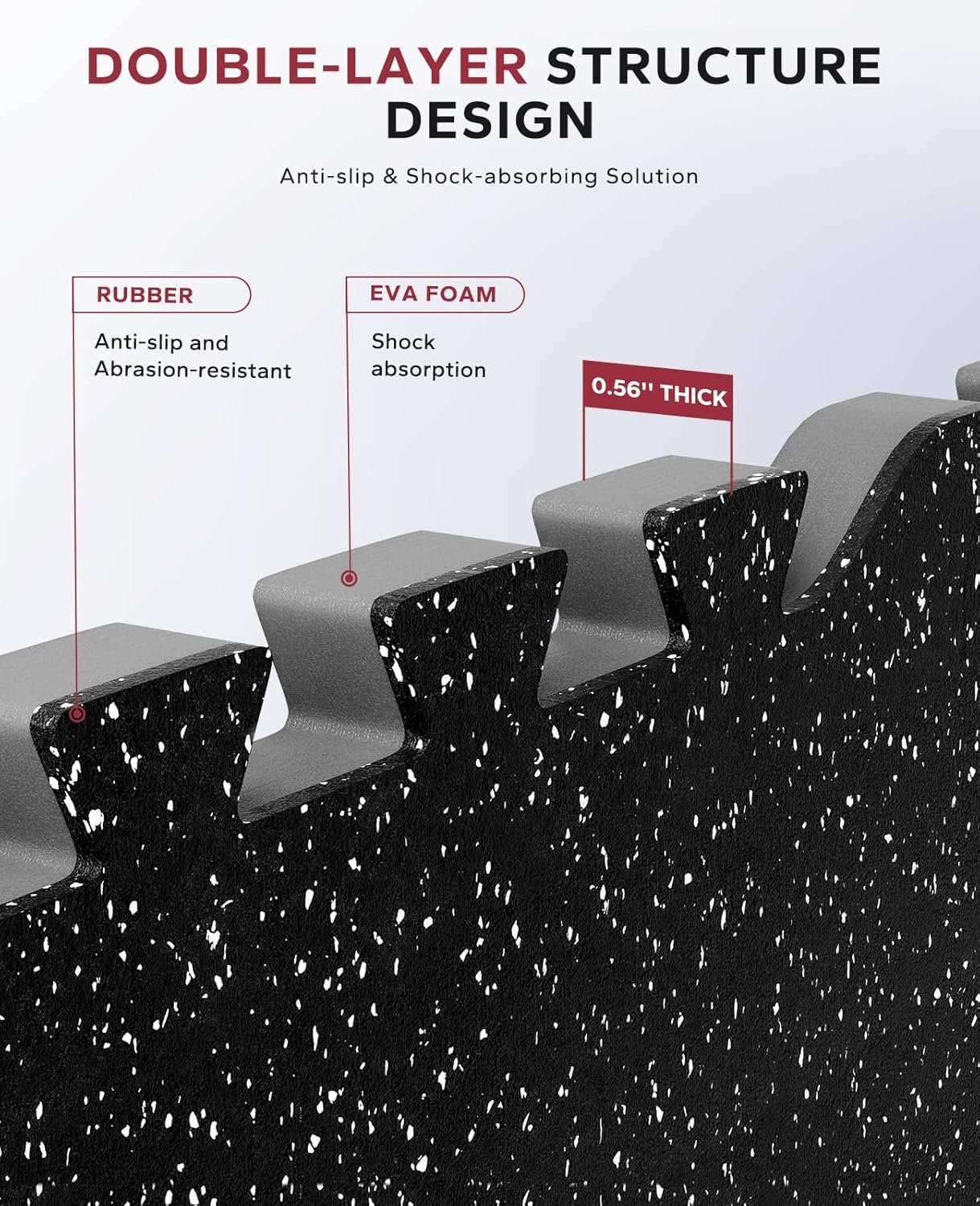 Rubber & EVA Dual-Layer Design:Our exercise mats have a two-layer design. The dense, textured rubber top ensures non-slip for stable heavy equipment. High-density EVA foam bottom absorbs shocks, reducing joint strain. The tough rubber-soft foam combo guarantees comfort and longer lifespan, a reliable fitness choice
