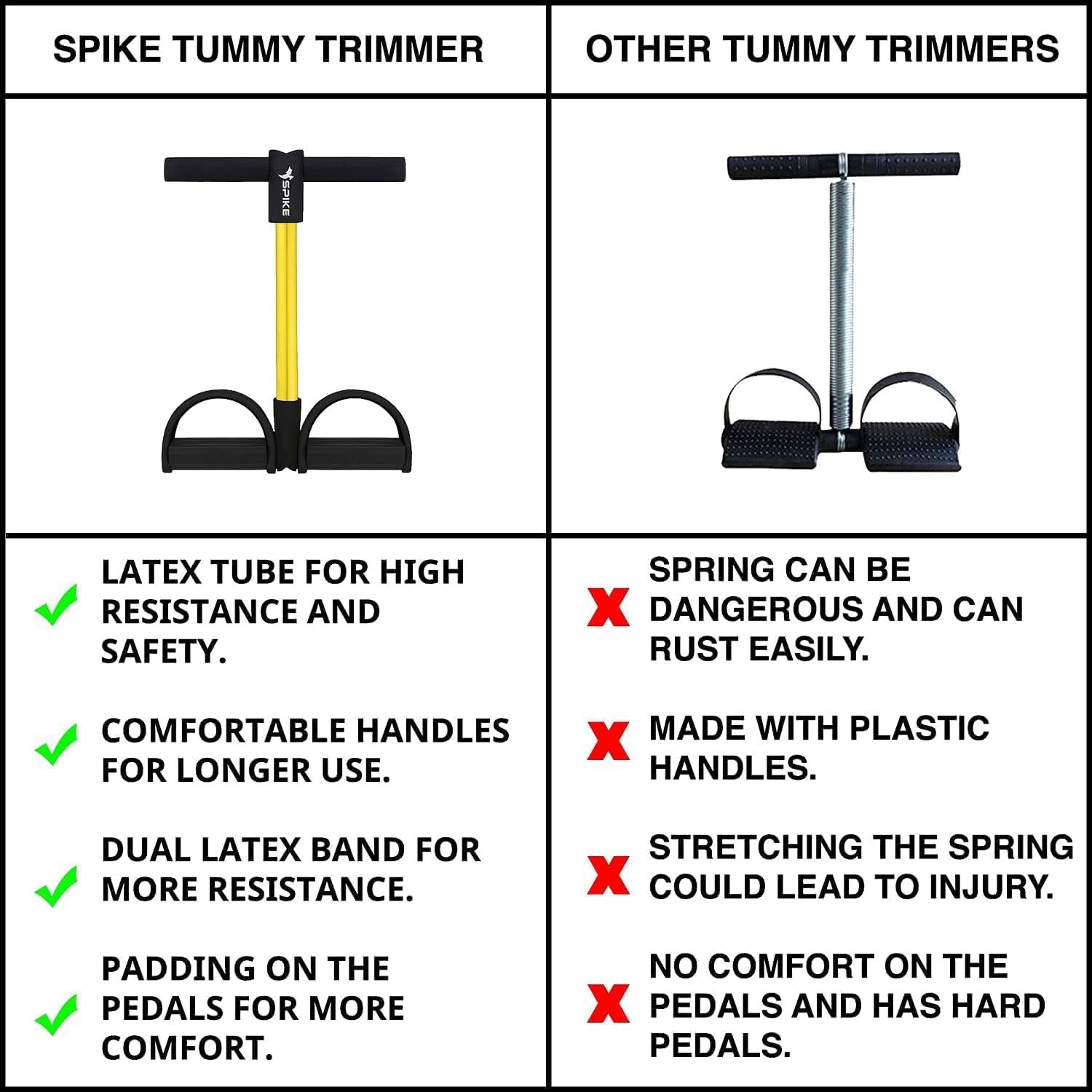 The Spike Tummy Trimmer Ab Exerciser for Men and Women has Strong elastic latex, featured with widening contoured footrest for safety and durability.