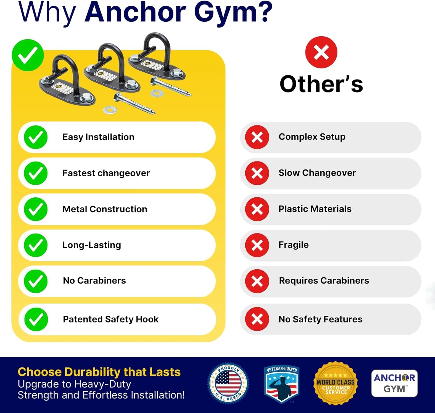 1️⃣ All Fitness Levels Welcome: The Anchor Gym Resistance Band Wall Anchor System is perfect for beginners to advanced athletes. Use any resistance level and easily switch between resistance bands, suspension straps, or bodyweight exercises, all with one powerful wall anchor for resistance bands setup. Ideal for strength training, this versatile system supports a wide range of fitness goals in home gym or professional environments.