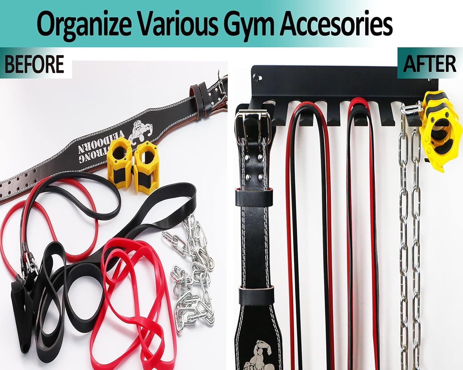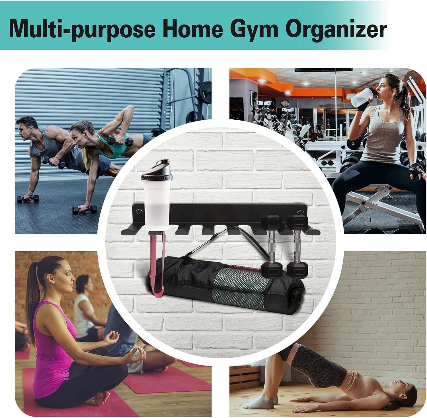 This gym storage rack characterized with 5 inch Long and Strong 8 prongs, designed to storet resistance band holders,Jump Rope Holders,Workout Belts,form roller and yoga mat