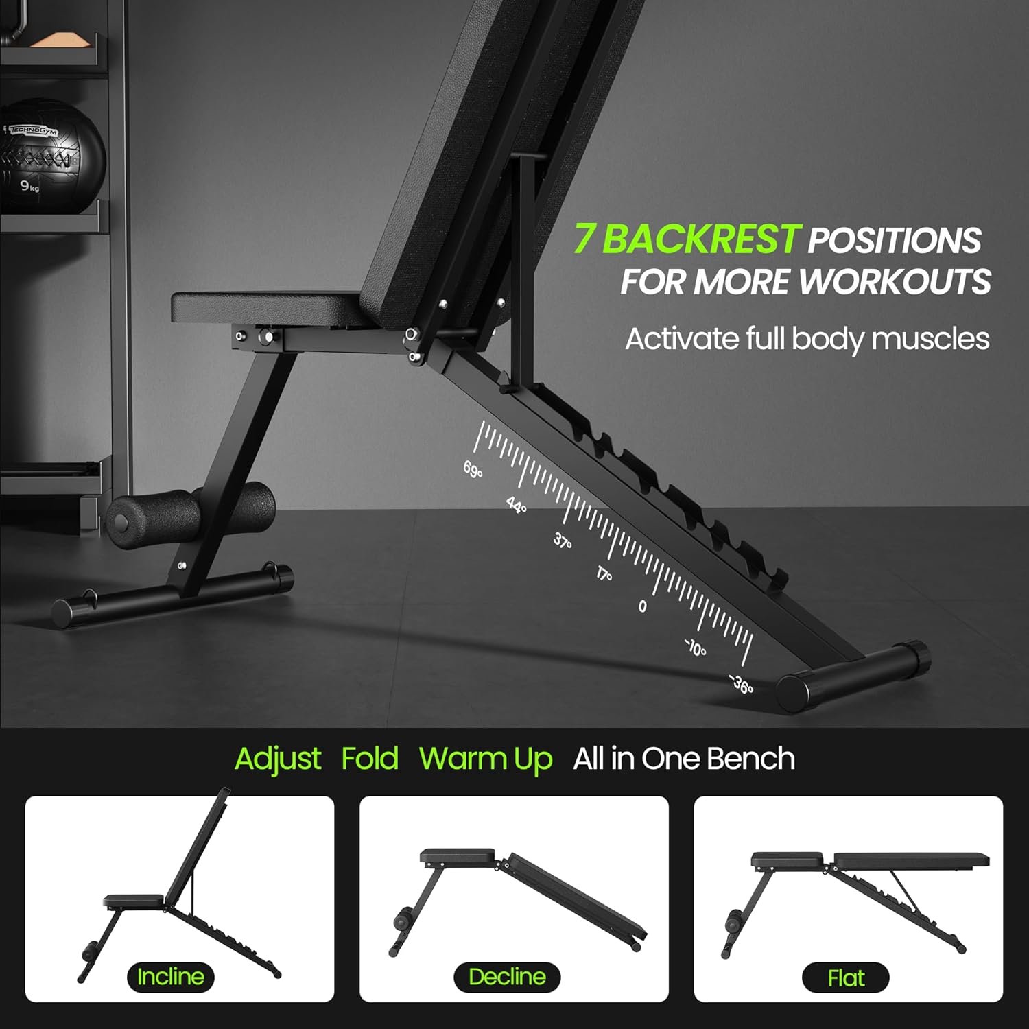 ADJUSTABLE WEIGHT BENCH – Flexible to adjust the backrest angle from 69°to -36°, this workout bench can be adjusted to three forms: Incline/Decline/Flat. Suitable for full body training in different postures according to your needs