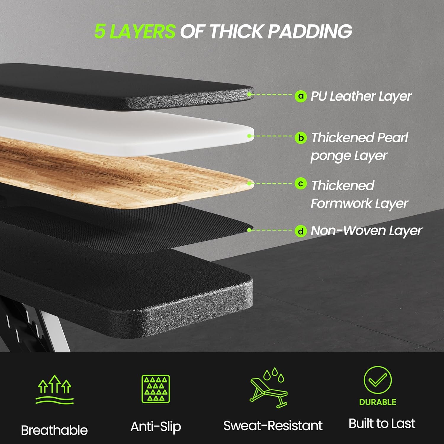 COMFORTABLE MATERIAL – The surface of weight bench is made of breathable leather, which is sweat-proof, anti-slip and easy to clean. High-quality & Eco-friendly foam padding to reduce muscle fatigue. Foldable weight bench is an ideal choice for home and gym