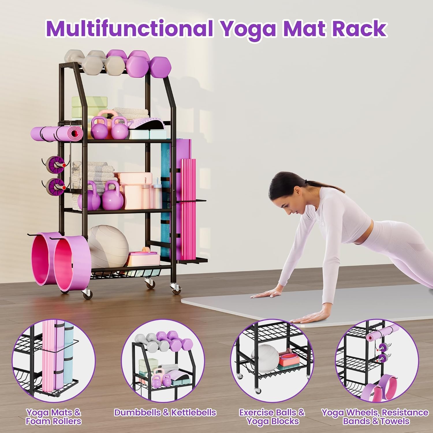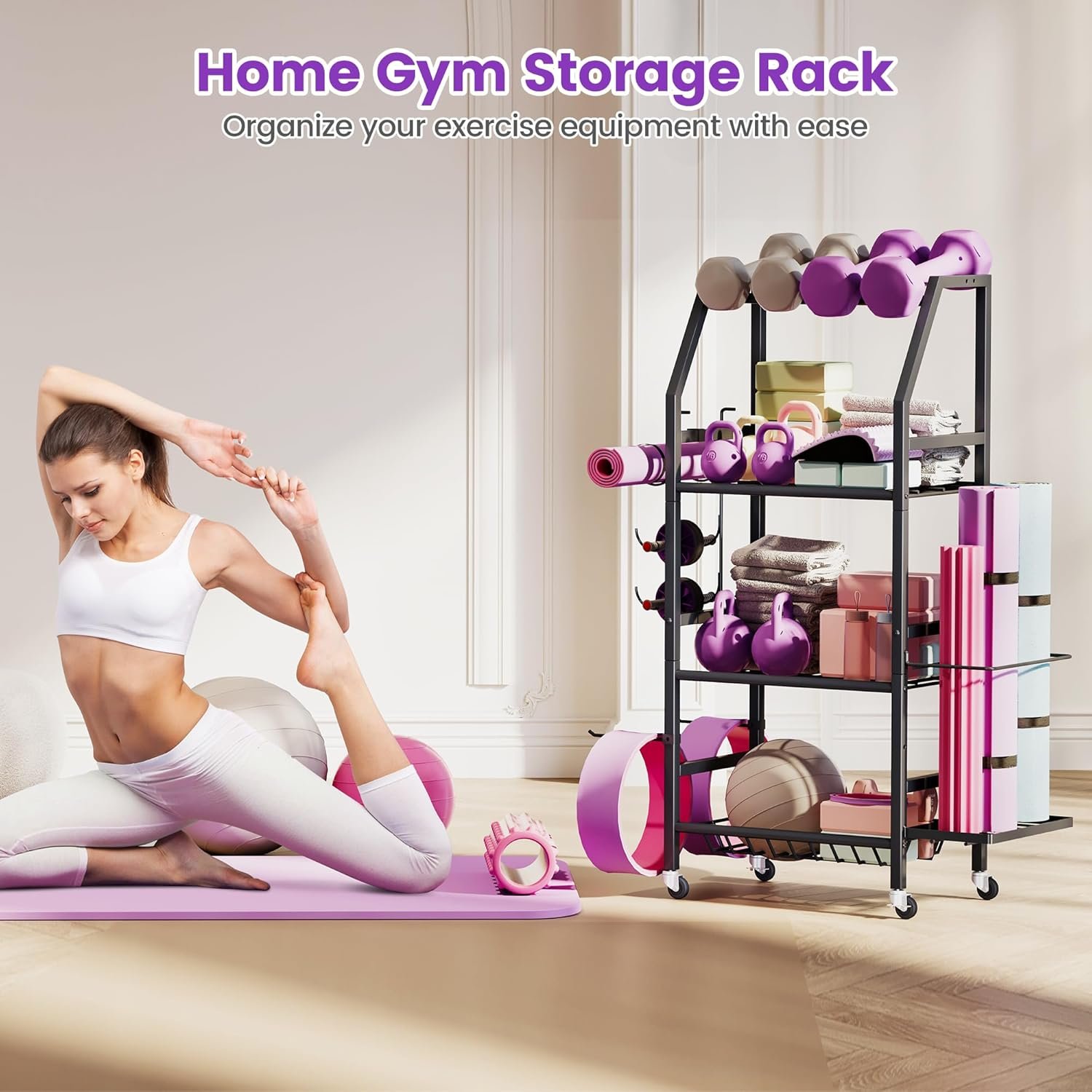 【Lockable Wheels & Extra Hooks】Featuring lockable wheels, this 4-Tier gym rack offers maximum mobility. Roll the weight rack from room to room, or lock the wheels in place for stability during use. The extra hooks provide additional hanging space for items like jump ropes, helmets, and sports bags. Whether you’re setting up a temporary workout area or need to rearrange your storage space, the lockable wheels and hooks make it incredibly convenient