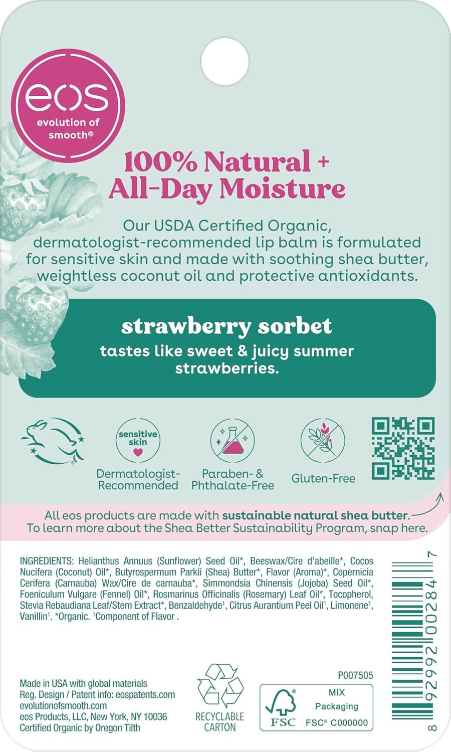 Discover a lip balm that’s 100% natural, organic, and delicious. Strawberry Sorbet lip balm flavor tastes like frozen sorbet made with vine-ripened summer strawberries. Our USDA Certified Organic, dermatologist-recommended lip balm is formulated for sensitive skin and made with soothing shea butter, weightless coconut oil, and protective antioxidants. eos lip balms use sustainably sourced ingredients to add all-day moisture to your skincare set. They are sure to leave your lips feeling buttery smooth, hydrated, and with a delicious taste all day long.