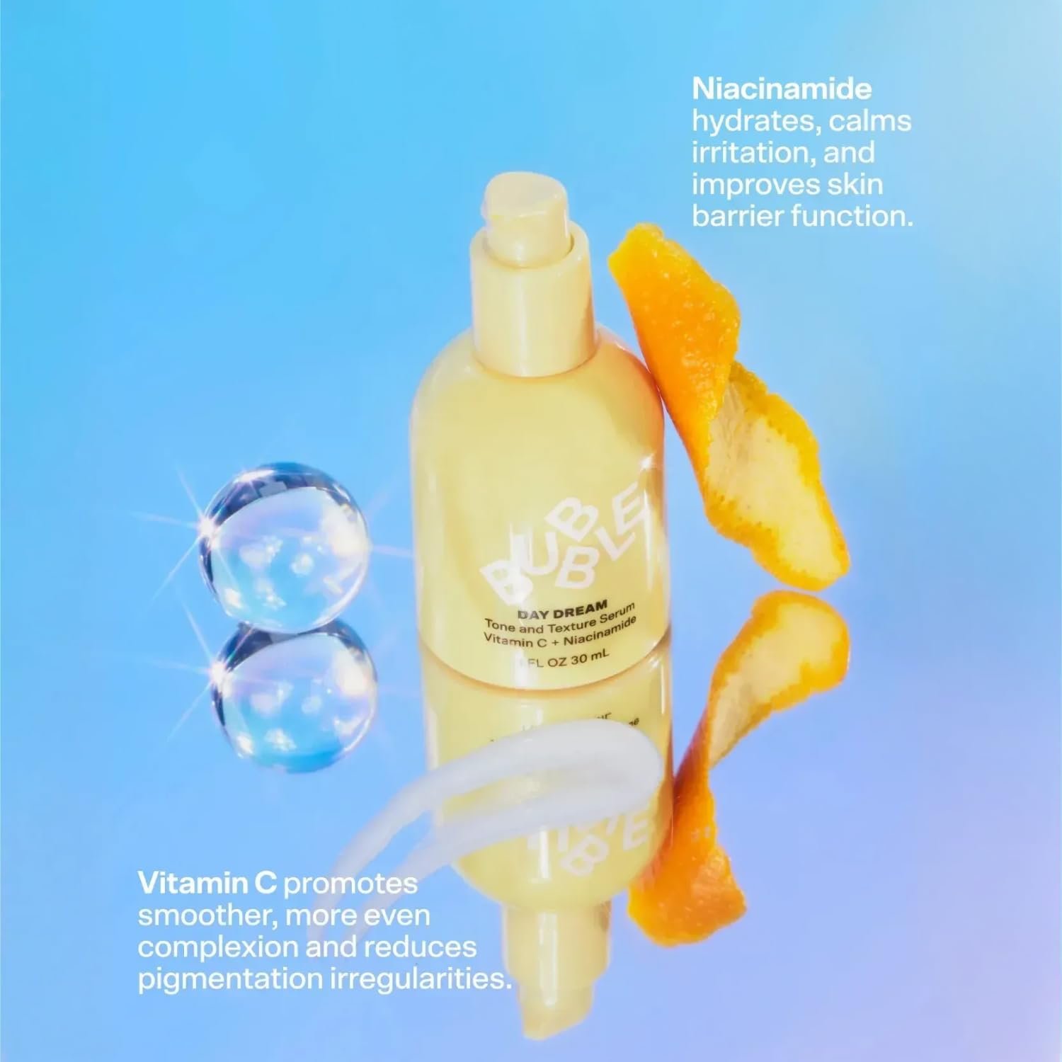 Turn Clear Skin Dreams Into Reality – This super unique combination of Vitamin C + Niacinamide is a scientific power couple for your skin. Bubble’s secret weapon glow serum helps support an even skin tone while giving your complexion a daily dose of brilliance. Vegan, cruelty-free and perfected by science.