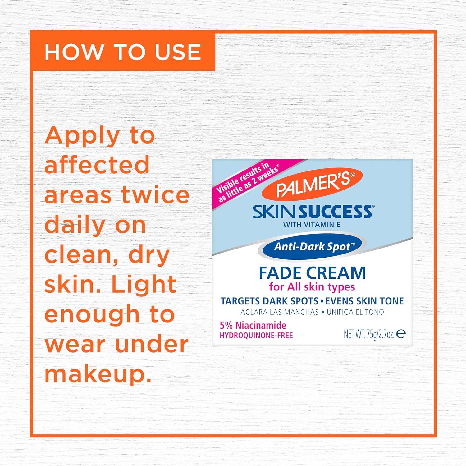 The wish list for skin is long for most people, as many want to reduce the signs of aging, eliminate dryness, have soft, smooth and supple skin, and avoid worrying about dully, dry skin. Whether you’re concerned about spots, dark marks, discoloration, or an uneven skin tone, you can fade dark marks naturally on your face and discover how to get an even skin tone on your body, too. So why not tackle those problems with products meant to produce a glowing complexion and brighter skin. A moisturizing fade cream or fade lotion is an integral part of the best regimen for glowing skin. Consistently applying a fade cream to serve as a dark spot remover for face during both your morning and evening skin care routines is the best way to tackle dull, dry skin and dark spots. With versions available for normal skin, oily skin, or dry skin types, Palmer’s Skin Success Anti-Dark Spot Face Cream balances uneven skin tone and discoloration. Now with 5% Niacinamide, and Free of Hydroquinone, Parabens, Phthalates, Sulfates, MI and Dyes, you can expect visible results in as little as 2 weeks.