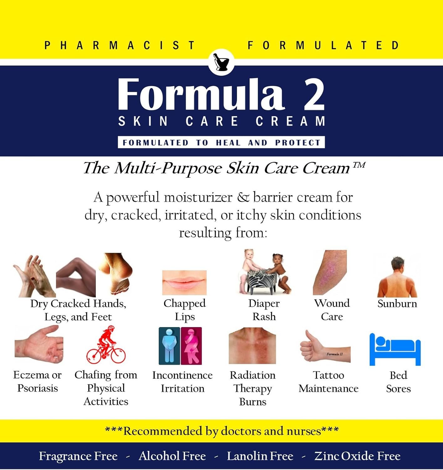 Formulated by a pharmacist with over 30 years of experience in chemistry and skin care. Formula 2 is a highly concentrated moisturizer and barrier cream for all types of dry, cracked, irritated or itchy skin conditions.