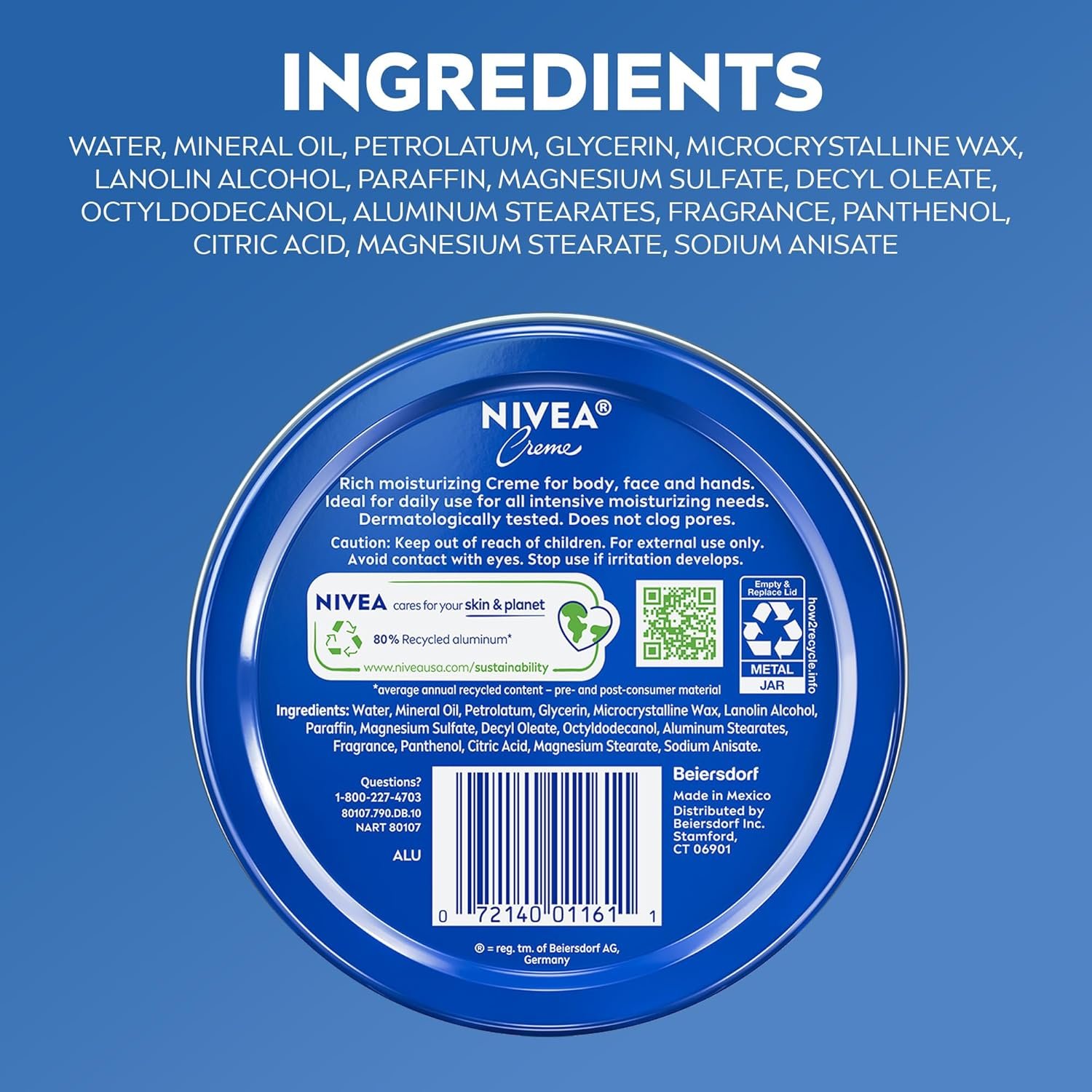 Includes one (1) 13.5 ounce Tin of NIVEA Creme Body, Face and Hand Moisturizing Cream