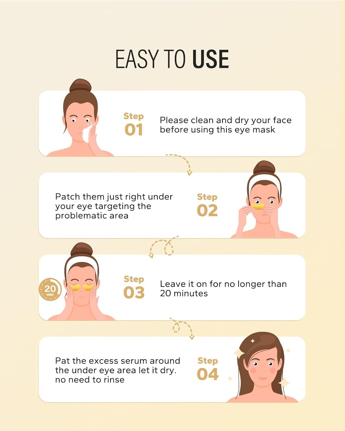Easy To Use: Clean your face and eyes with warm water, then put eye pads under your eyes and press gently to secure them. Keep it for 20 minutes, remove the eye pads and gently pat the remaining essence. Twice a day or at least once a week.