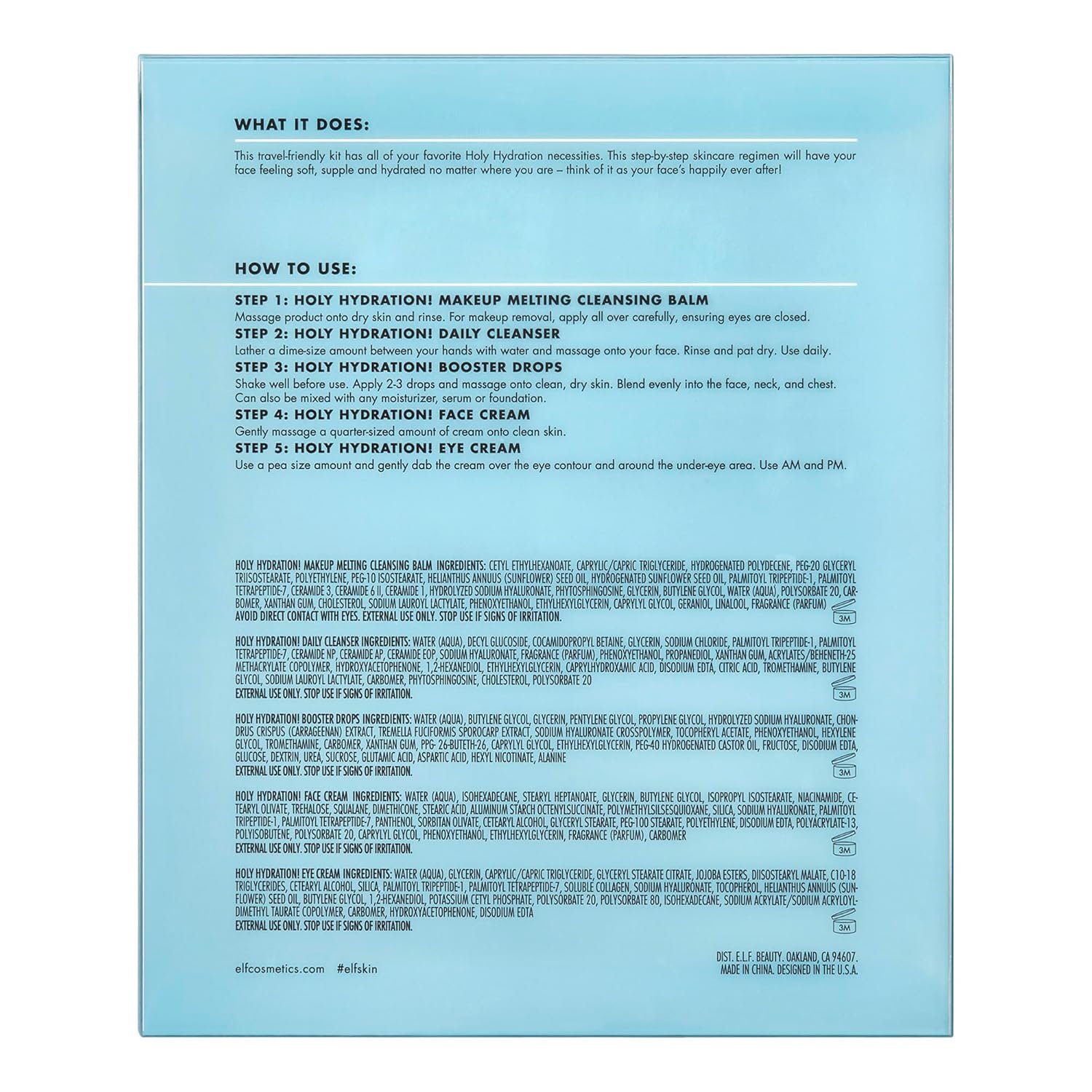 A COMPLETE HYDRATION REGIMEN: This skincare kit has all of your favorite Holy Hydration necessities- a Holy Hydration. Daily Cleanser, Holy Hydration. Makeup Melting Cleansing Balm, Hydrating Booster Drops, Holy Hydration. Face Cream and Eye Cream.
