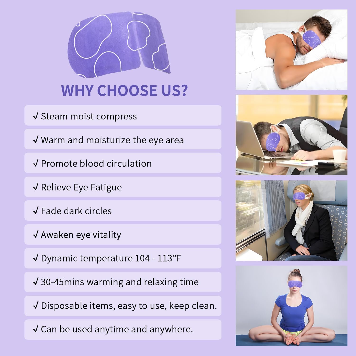【Clean & Hygienic】Made of high-quality materials, soft and fits the eyes without any burden. Disposable Self Heating Moist Heat Eye Masks adopts a disposable design, Produced in a sterile environment and individually packaged. Making it clean and convenient to use.