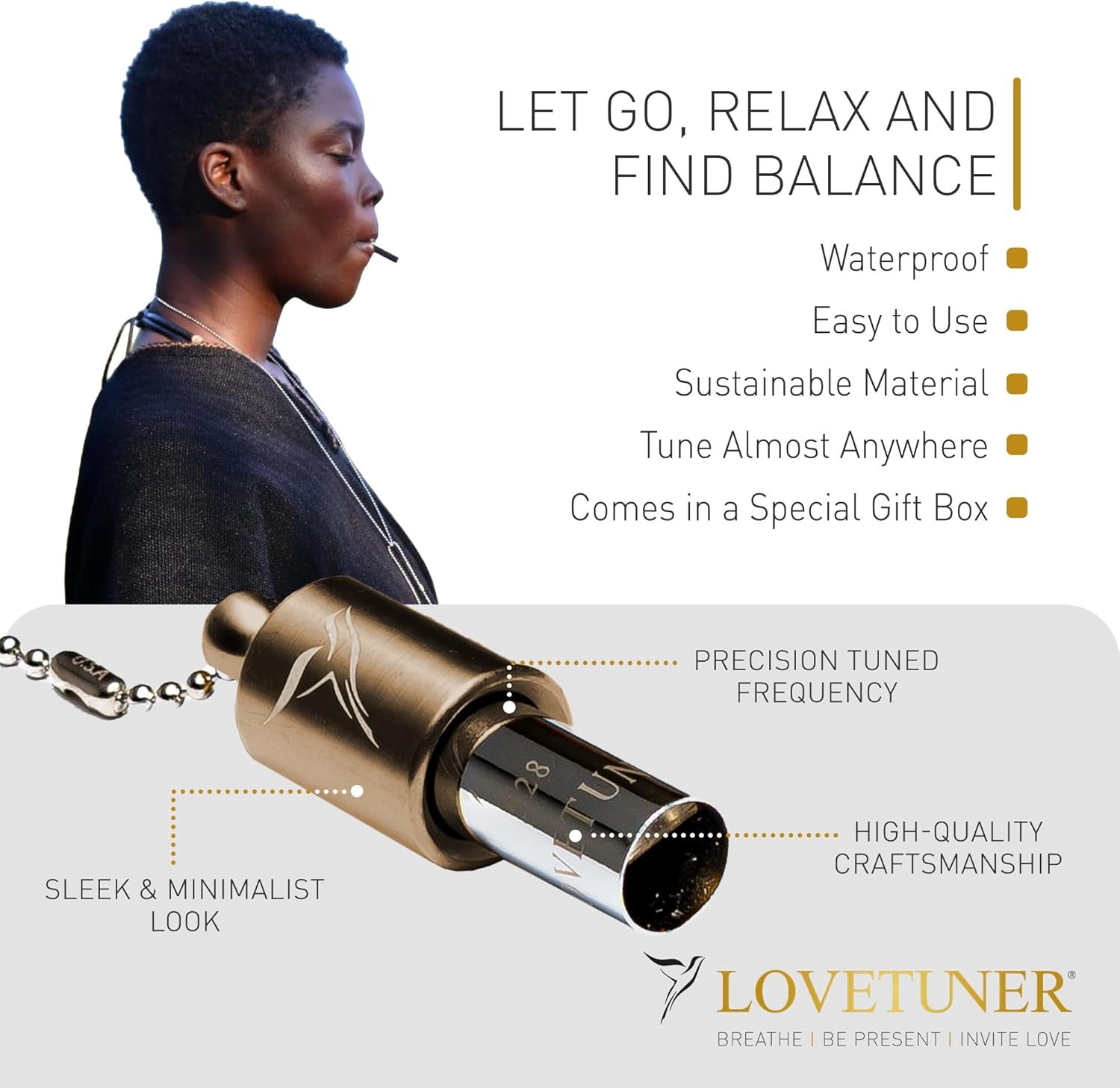 The LOVETUNER necklace, calibrated to emit 528 Hz, the so-called Love Frequency, is a unique breathing and mindfulness tool designed to foster mental and physical harmony. This compact, single-tone flute enables easy, on-the-go meditation, helping you achieve a centered, peaceful state anytime, anywhere. LOVETUNER encourages mindful breathing to prevent burn out, reduce stress, regulate your breath, improve resilience and homeostasis on a cellular level. Beautifully packaged with options for a waxed cotton cord or ball chain, it’s a thoughtful gift for those seeking balance, and inner peace.