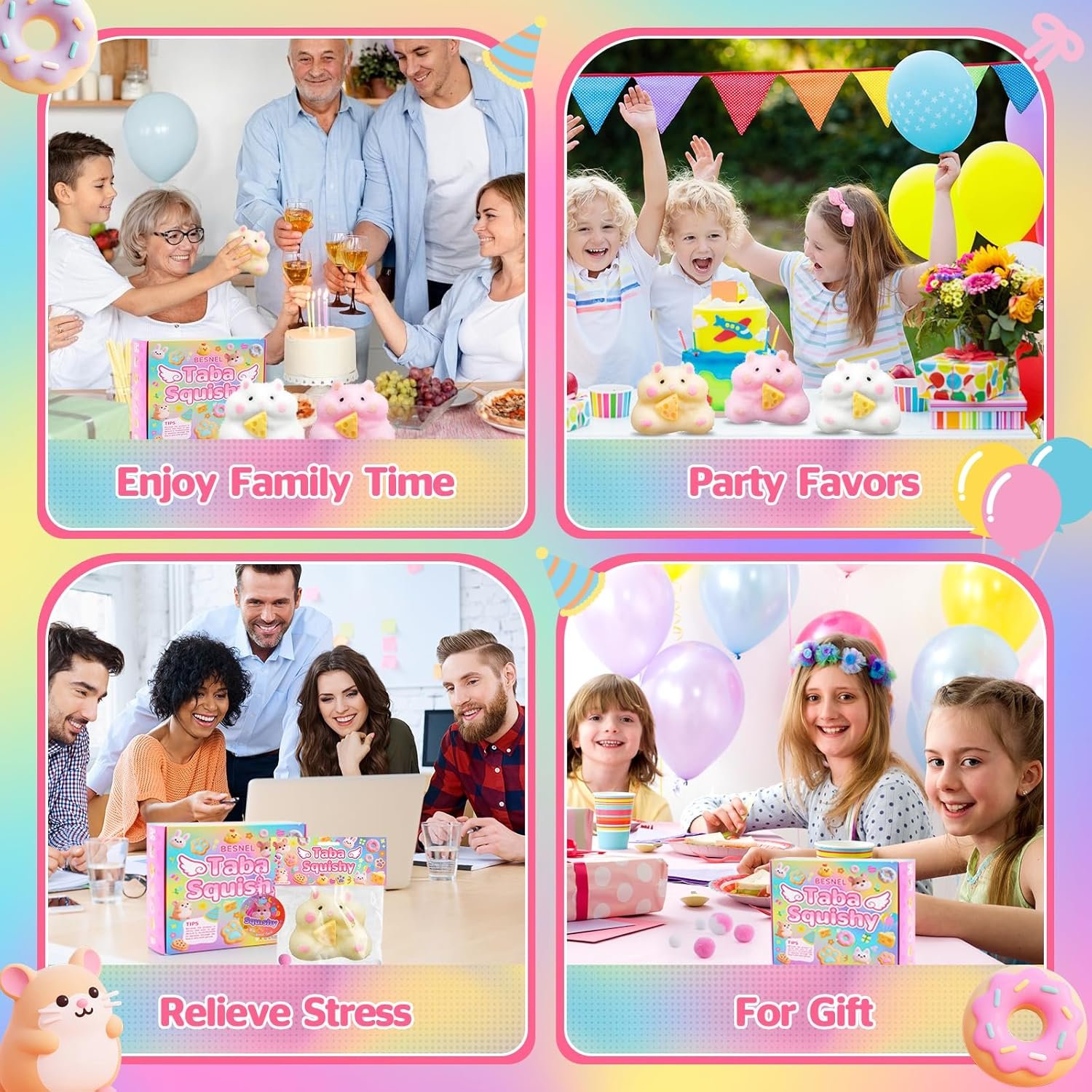 【The Perfect Gift Kit】A set of products includes 4 cute hamster toys, accompanied by an exquisite gift box. Can be used as birthday and party gifts, classroom prizes, etc., to add fun to parties and classes. The taba squishy hamster toys are also the best choice for various holiday gifts, such as Thanksgiving, Halloween, Christmas, etc.