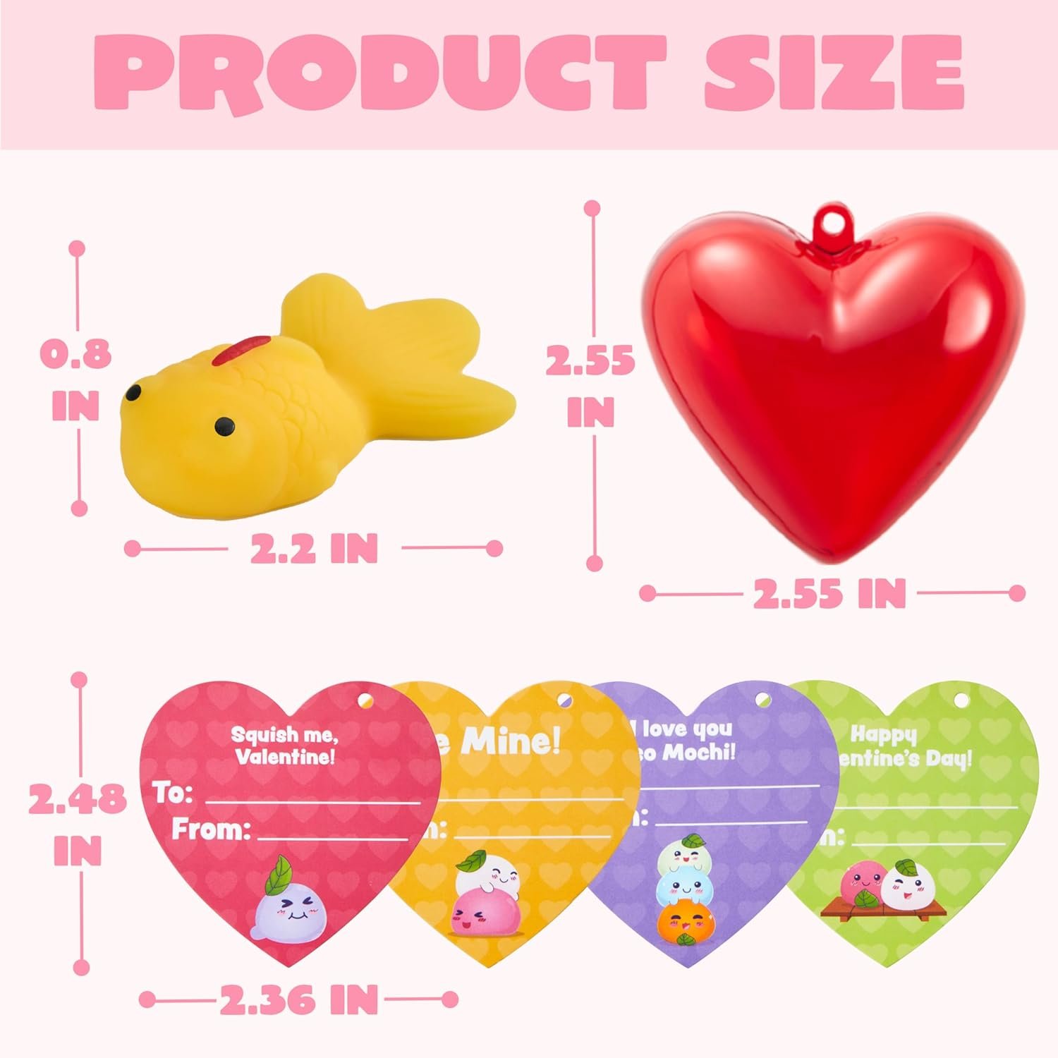 VALUE SET: Our valuable Valentine party favors set includes 28 cute mochi squishy toy, 28 red heart cases, and 28 valentine cards featuring 4 designs. Each heart-shaped case was prefilled with mochi squishy toys