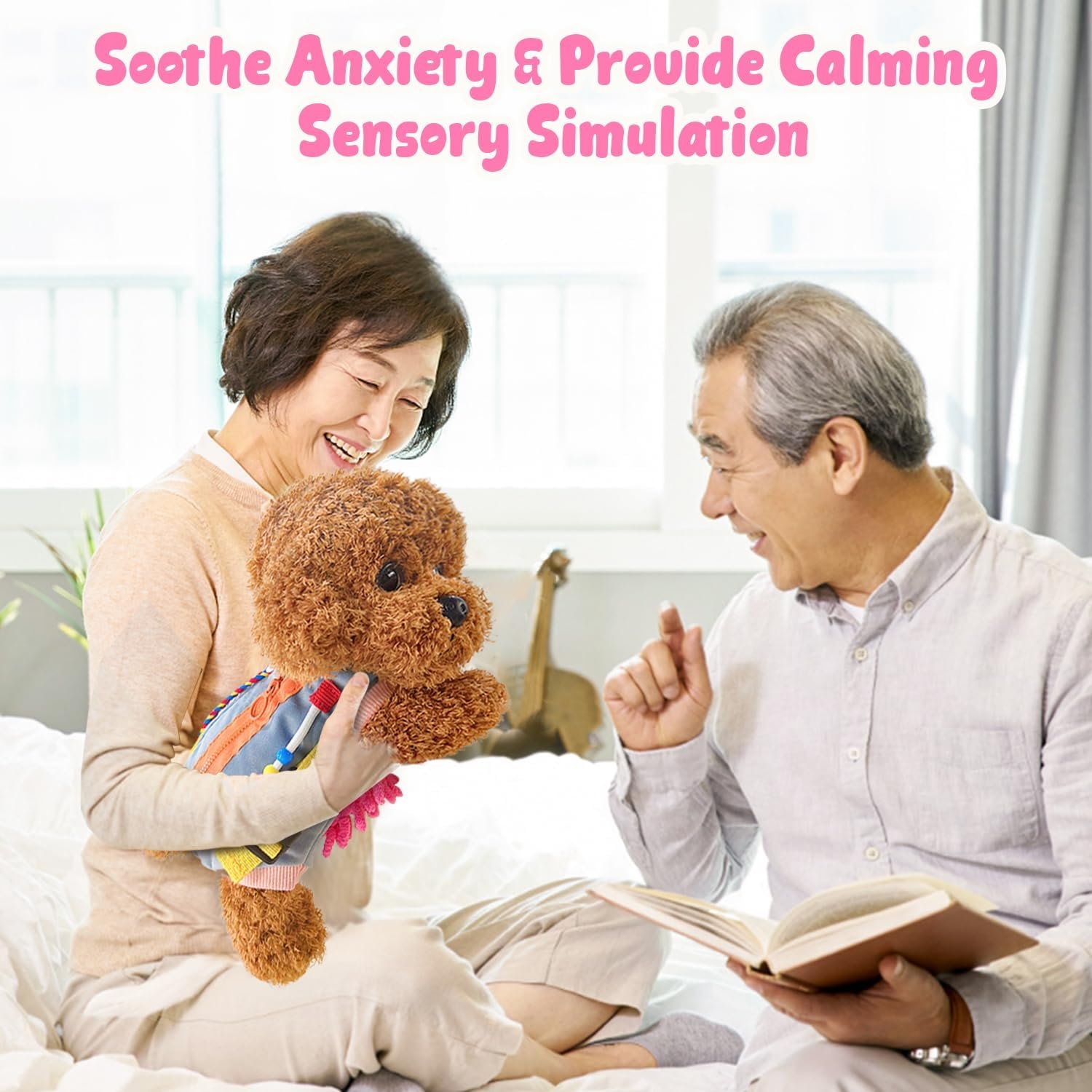 SOOTHE ANXIETY & PROVIDE CALMING SENSORY STIMULATION This dog-shaped fidget blanket for adults with dementia, Alzheimers, Autism, ADHD, Aspergeris designed to offer a comforting focus. The variety of sensory activities helps reduce restlessness, agitation, and anxiety, providing a peaceful and warm hugging companion that promotes relaxation for your loved one.