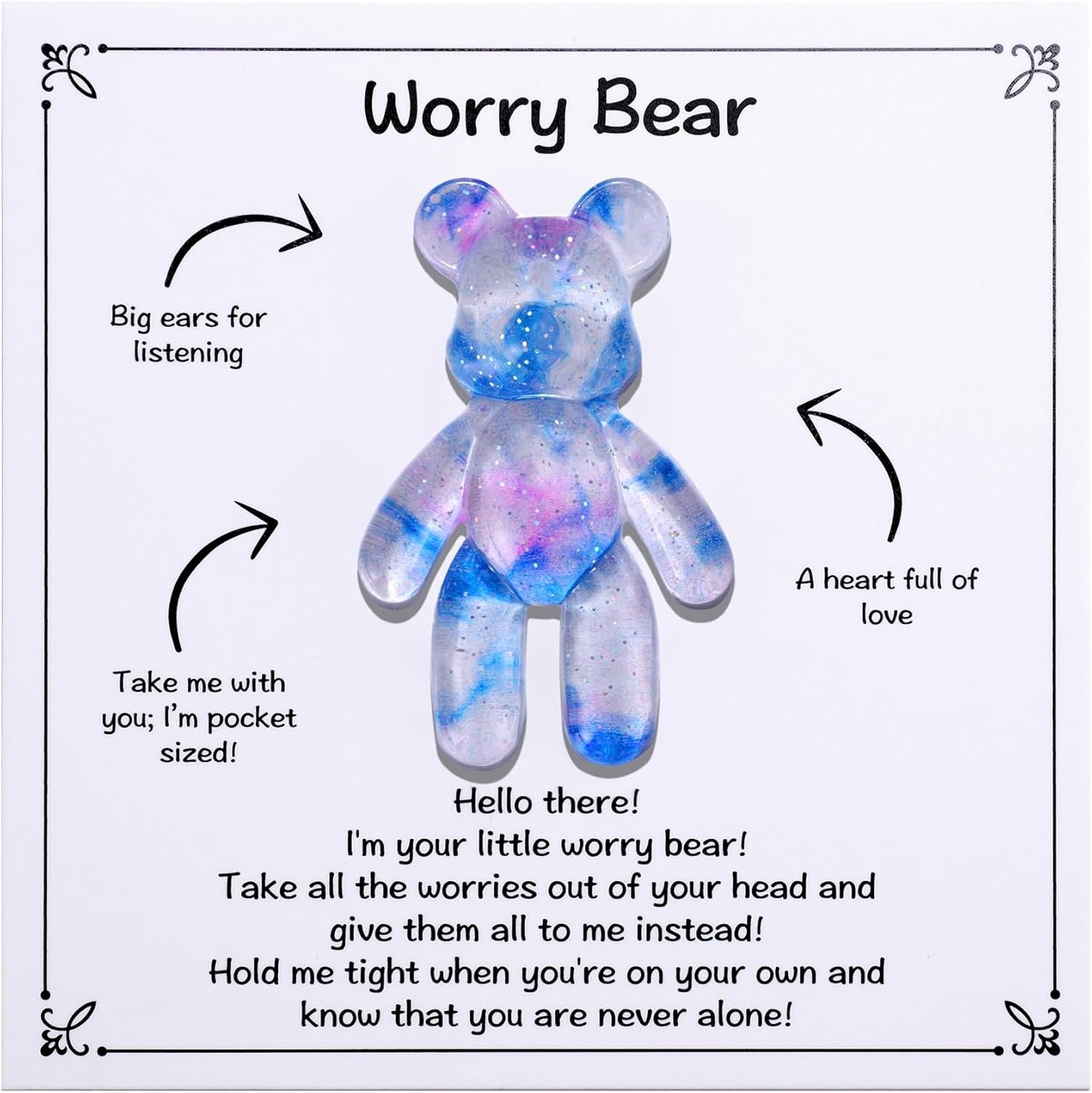 Material — Made of durable, high-quality materials, each worry bear is designed to last. Measuring 1.69 in x 1.06 in, it’s lightweight and easy to carry, making it ideal for keeping in your pocket, purse or desk. This mini bear offers a tangible way to let go of worries while reminding you of the comfort it represents.
