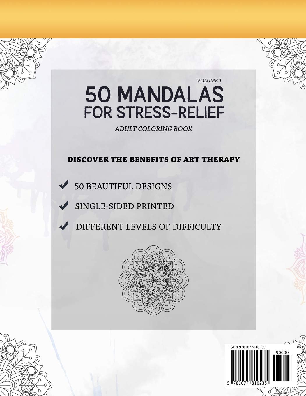 50 BEAUTIFUL MANDALAS for adultsONE SIDE PRINTED: The following design is not affectedSTRESS RELIEVING: the coloring of the mandalas helps relieve stressDIFFRENT LEVELS OF DIFFICULTY: from beginners to advanced