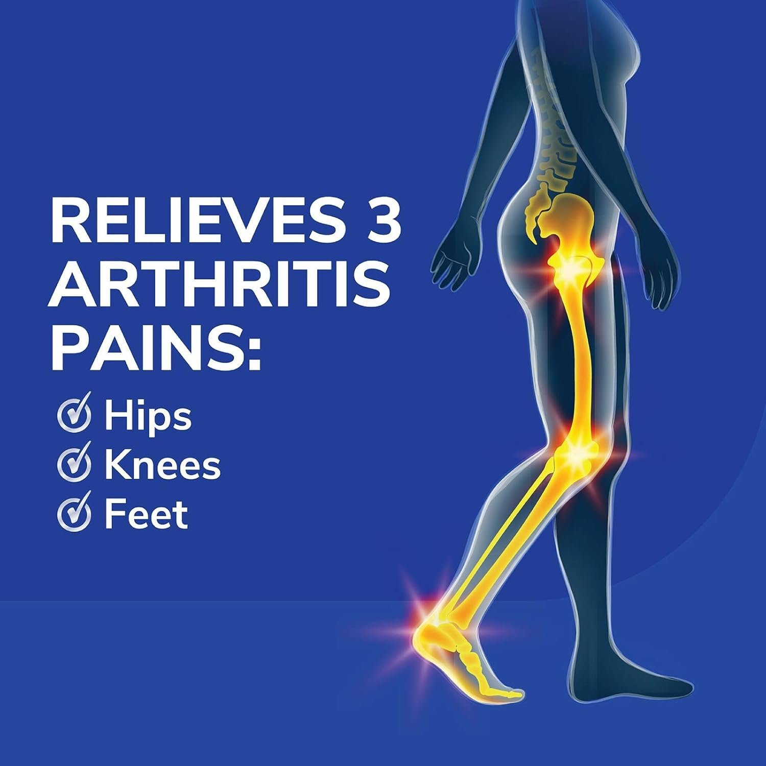 Relieves arthritis pains in 3 lower body points: hips, knees, feet