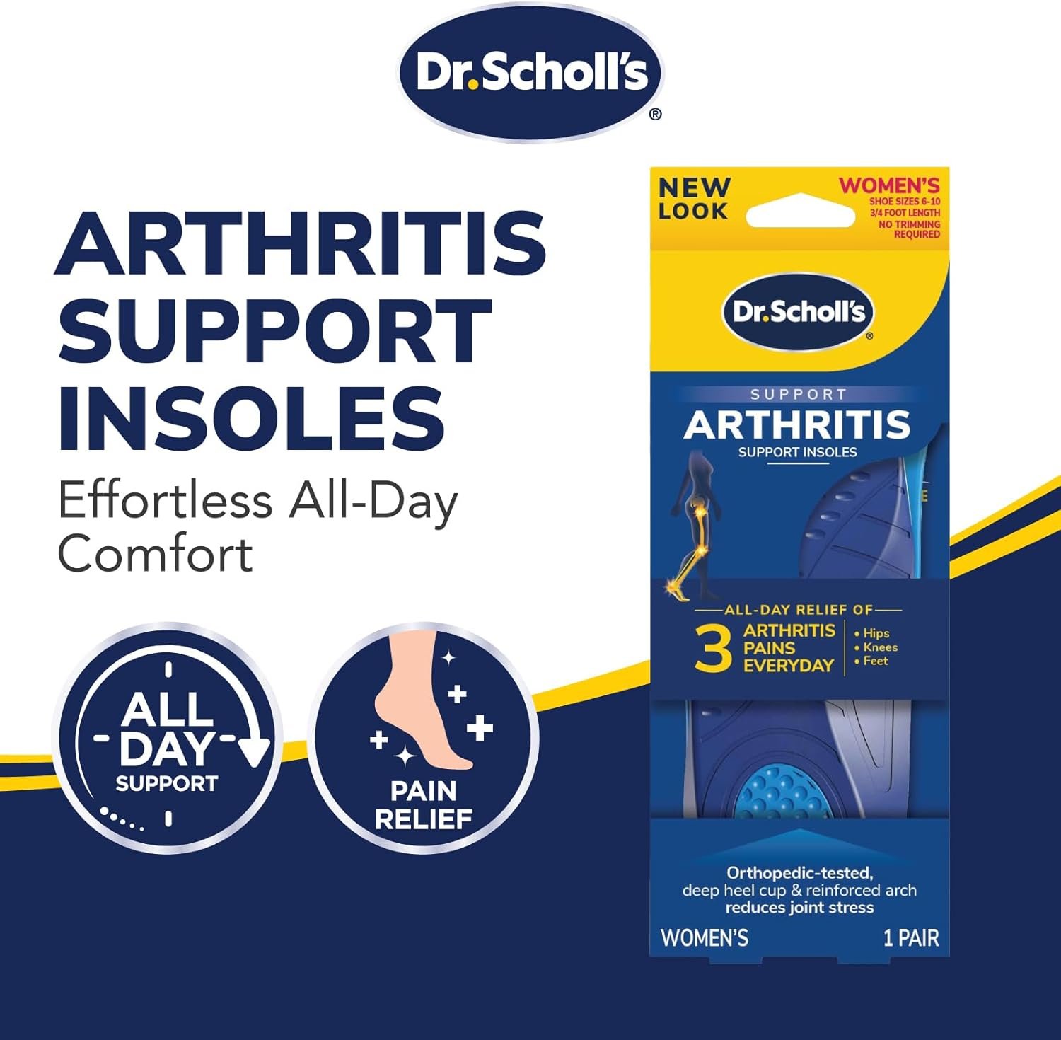 Dr. Scholl’s® Arthritis Support Insoles are scientifically designed and engineered for Women who suffer from osteoarthritis pain in the feet, knees and hips. Clinically proven to provide relief to arthritic lower body joints. These insoles have an Orthopedist-tested deep heel cup & reinforced arch to reduce joint stress. Provides all day relief and all day support!