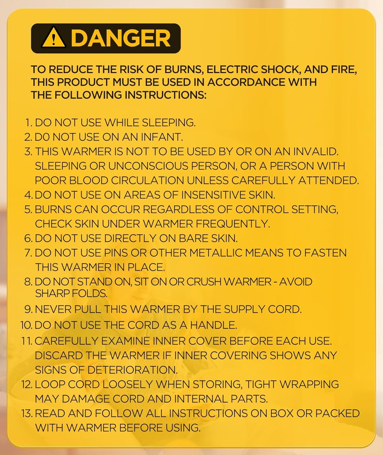 【SAFETY USE REMINDERS】Please use the heating shawl only as instructed in the user manual to ensure safe and comfortable heating. Avoid direct skin contact and do not use it for extended periods to prevent burns. Do not operate the product with unauthorized voltage or adapters. Keep the shawl flat during use—do not fold, crush, bend, or place heavy pressure on it. Proper and careful usage will help maintain safety, extend product life, and ensure optimal performance.