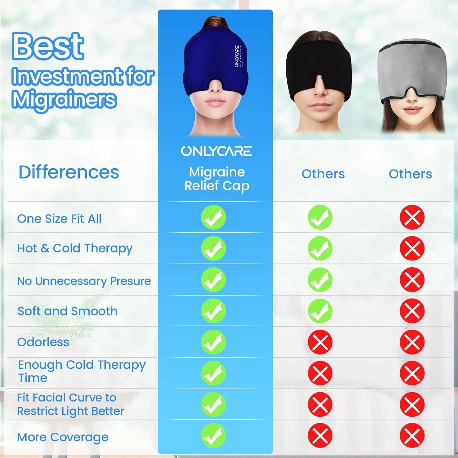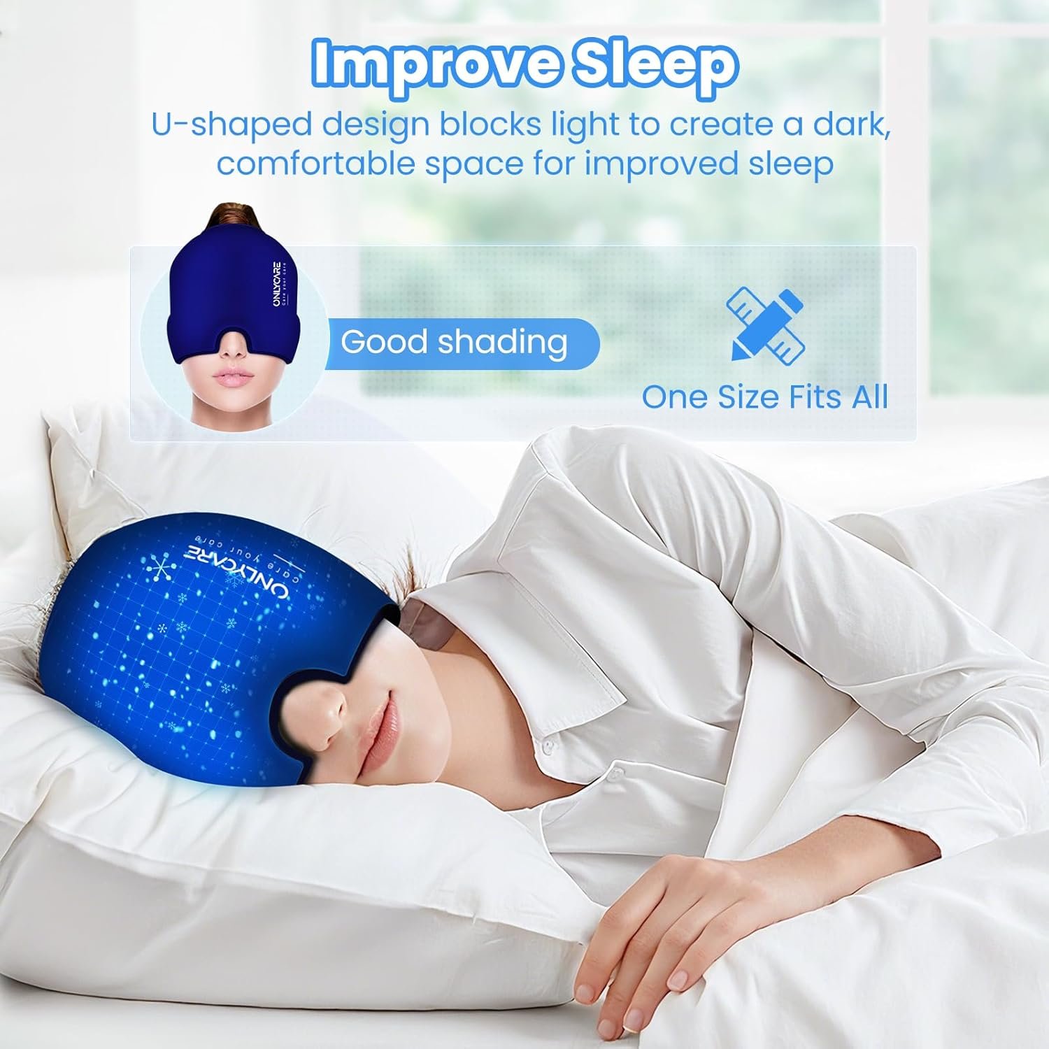 [Upgraded Hot & Cold Natural Relief Cap]: The ONLYCARE headache migraine mask offers natural relief through dual hot and cold therapy. Cold therapy helps shrinking blood vessels, slow nerve signals, and reduce muscle tension. Heat soothes muscles, boosts circulation, and eases eye pressure. This Physical, non-invasive head wraps for women men offers targeted comfort for migraines, headaches, eyes strain, sleep troubles and facial tension, all without medication.