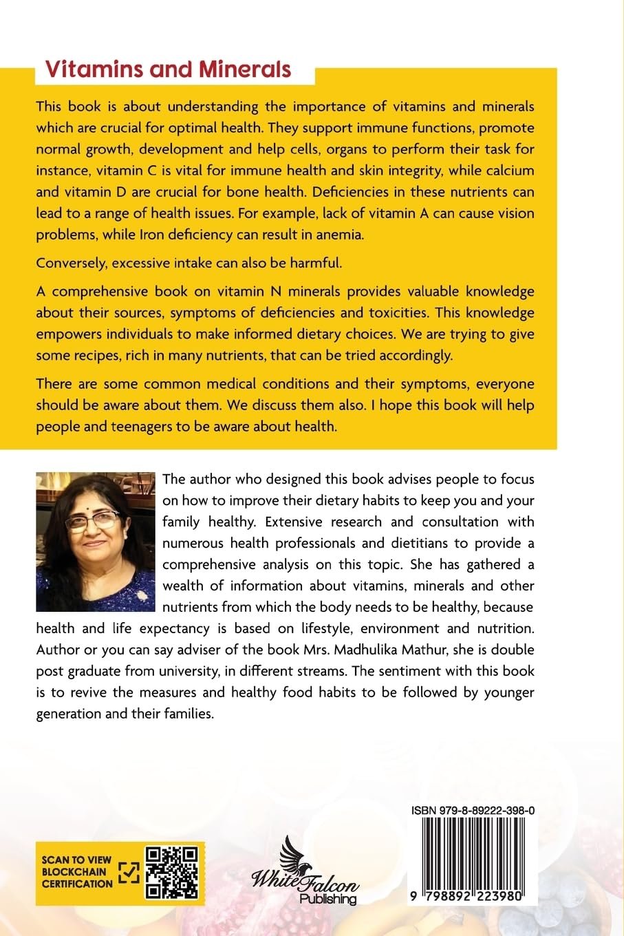 This book is about to understanding the importance of vitamins and minerals. Which are crucial about optimal health. they support immune functions, promote normal growth, development and help cells and organs perform their task for instance, vitamin c is vital for immune health and skin integrity, while calcium and vitamin D are crucial for bone health. deficiencies in these nutrients can lead to a range of heath. issues. For example, lack of vitamin A can cause vision problems, while Iron deficiency can result in anemia.