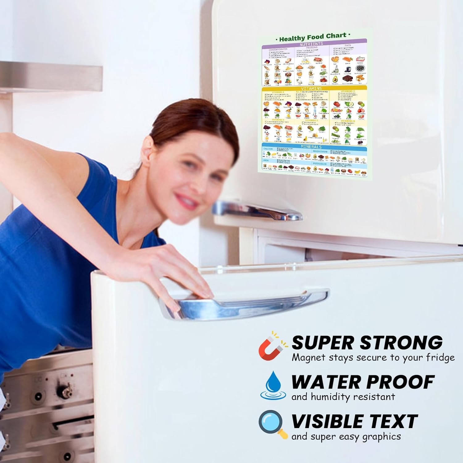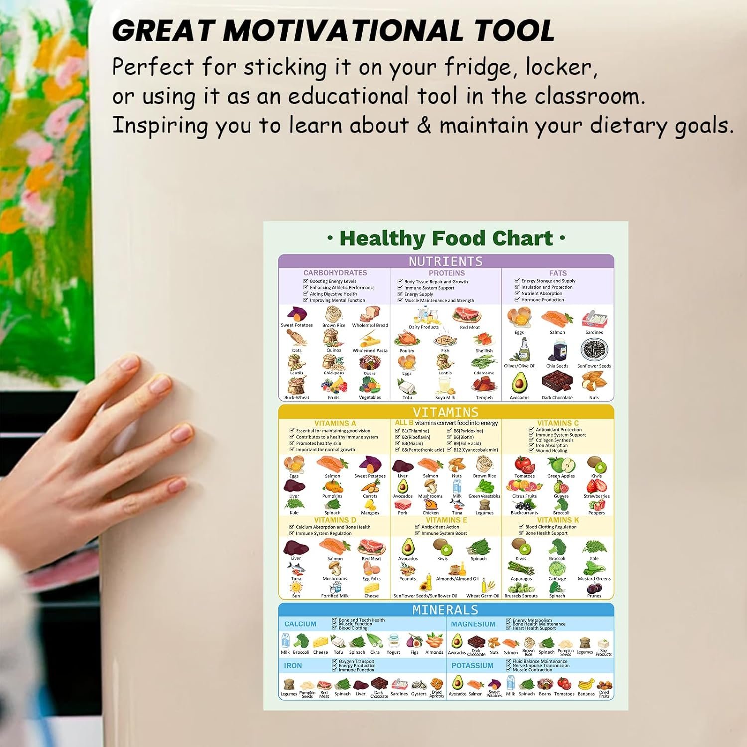 Magnetic food chart: The food chart is equipped with a magnetic backing that can easily attach to any magnetic surface, such as fridge doors, kitchen cabinets or whiteboards. Without pressure about install and disassemble, and there is no need to worry about scratching the surface of the refrigerator. Always keep the healthy food chart within reach.