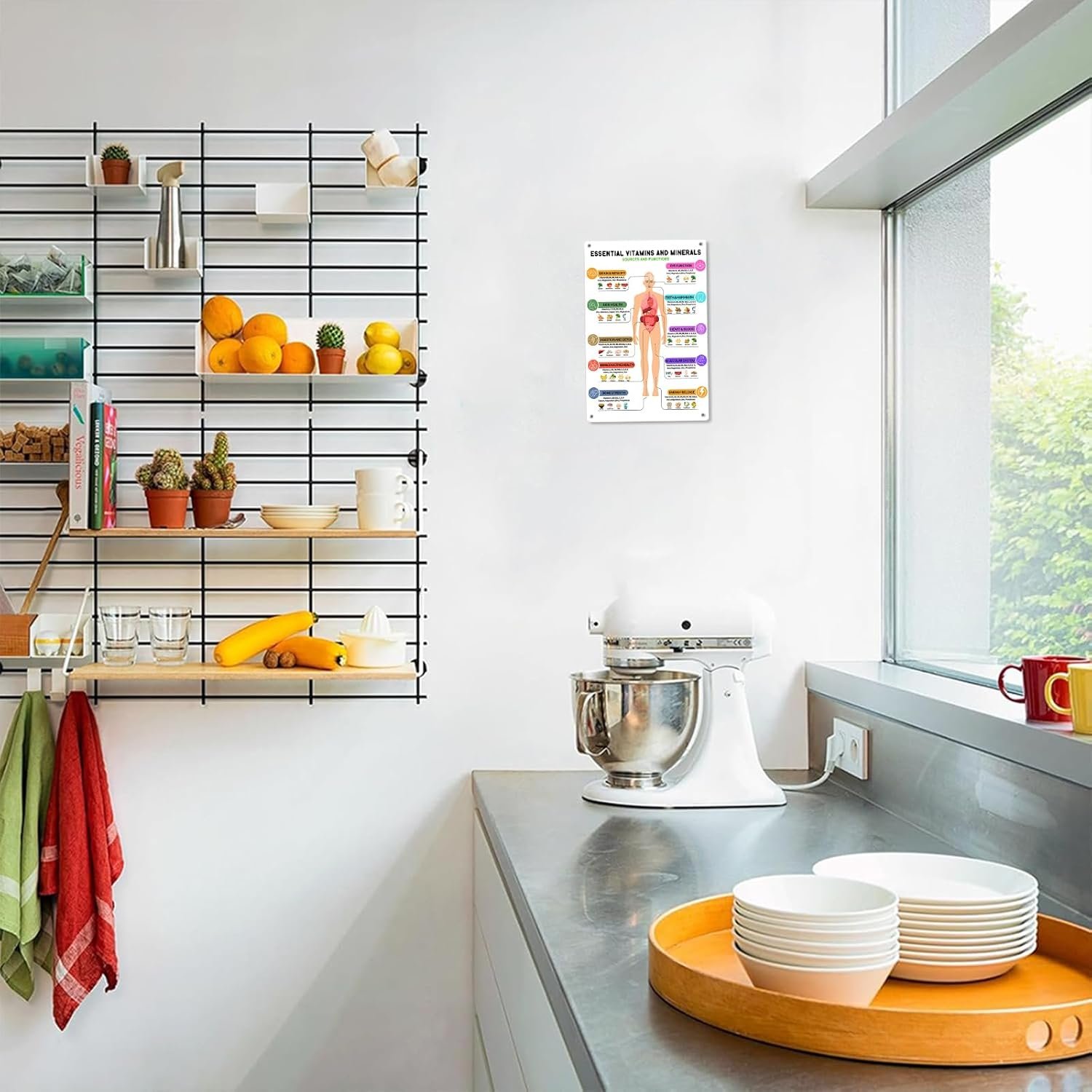 Elevate your kitchen or restaurant decor with the Essential Vitamins And Minerals Metal Sign. This 8×12 inch aluminum tin sign is not just a decorative piece but also a comprehensive nutritional guide. It features a detailed food sources chart for essential vitamins and minerals, making it easy to understand which foods are best for brain, skin, and digestive health. Additionally, the high fiber foods chart helps you make informed choices for a balanced diet. Crafted from durable aluminum, this sign is designed to withstand the test of time, ensuring it remains a lasting and useful addition to your space. Its versatile design makes it perfect for both home kitchens and commercial settings, adding both educational and aesthetic value. Installation is a breeze with pre-drilled holes, allowing you to easily hang it in your preferred location. Enhance your environment with the Essential Vitamins And Minerals Metal Sign and enjoy the benefits of a well-informed and healthy lifestyle. Order yours today and transform your space into a hub of nutrition and style!